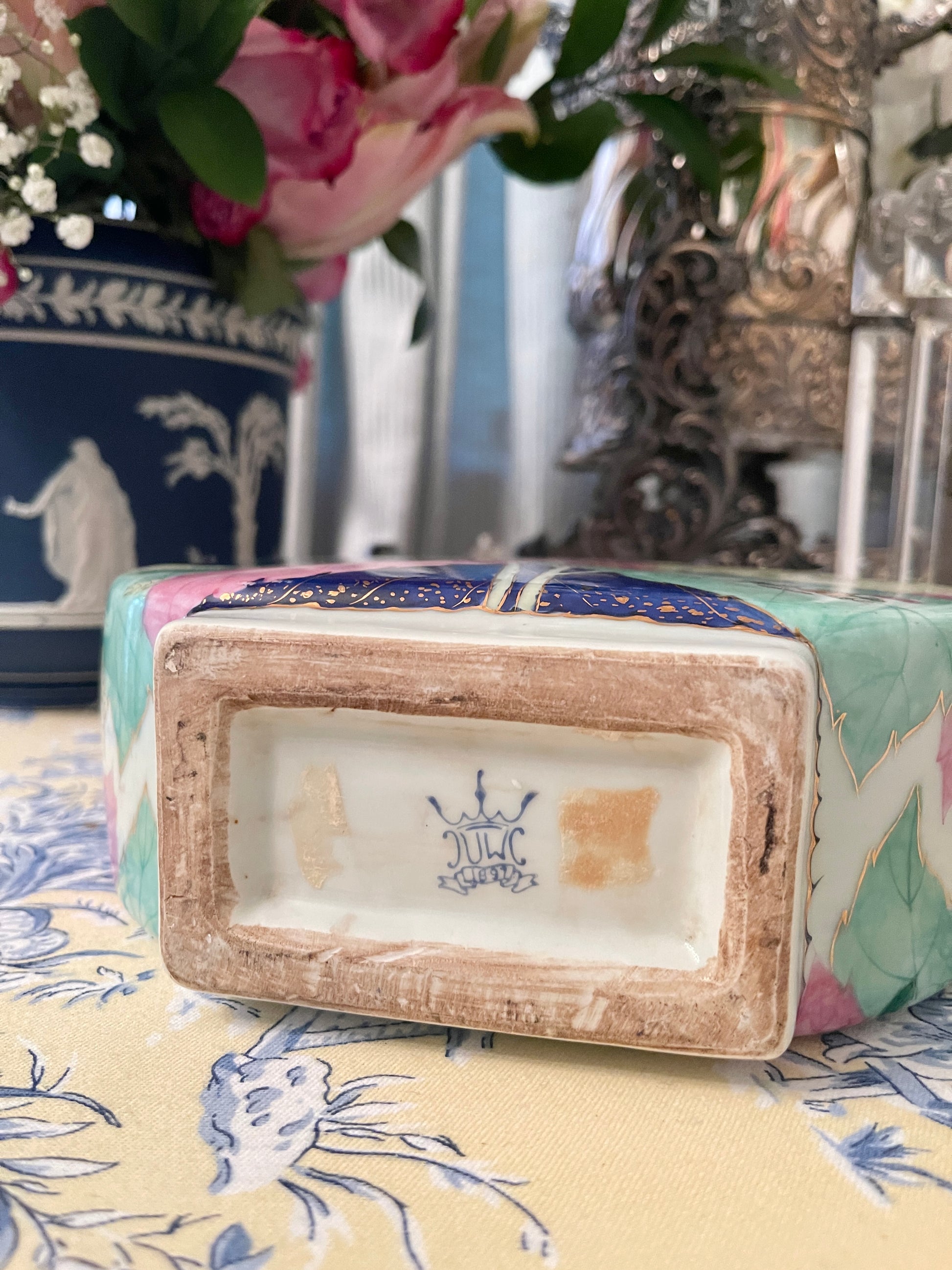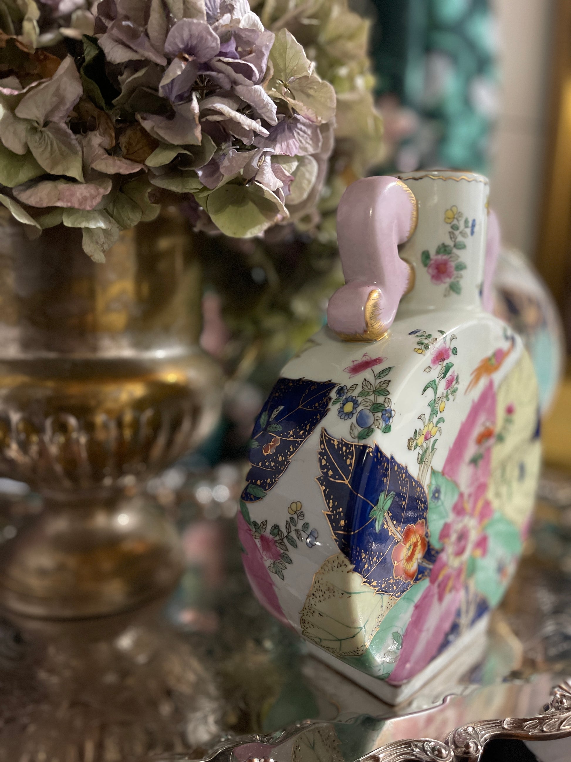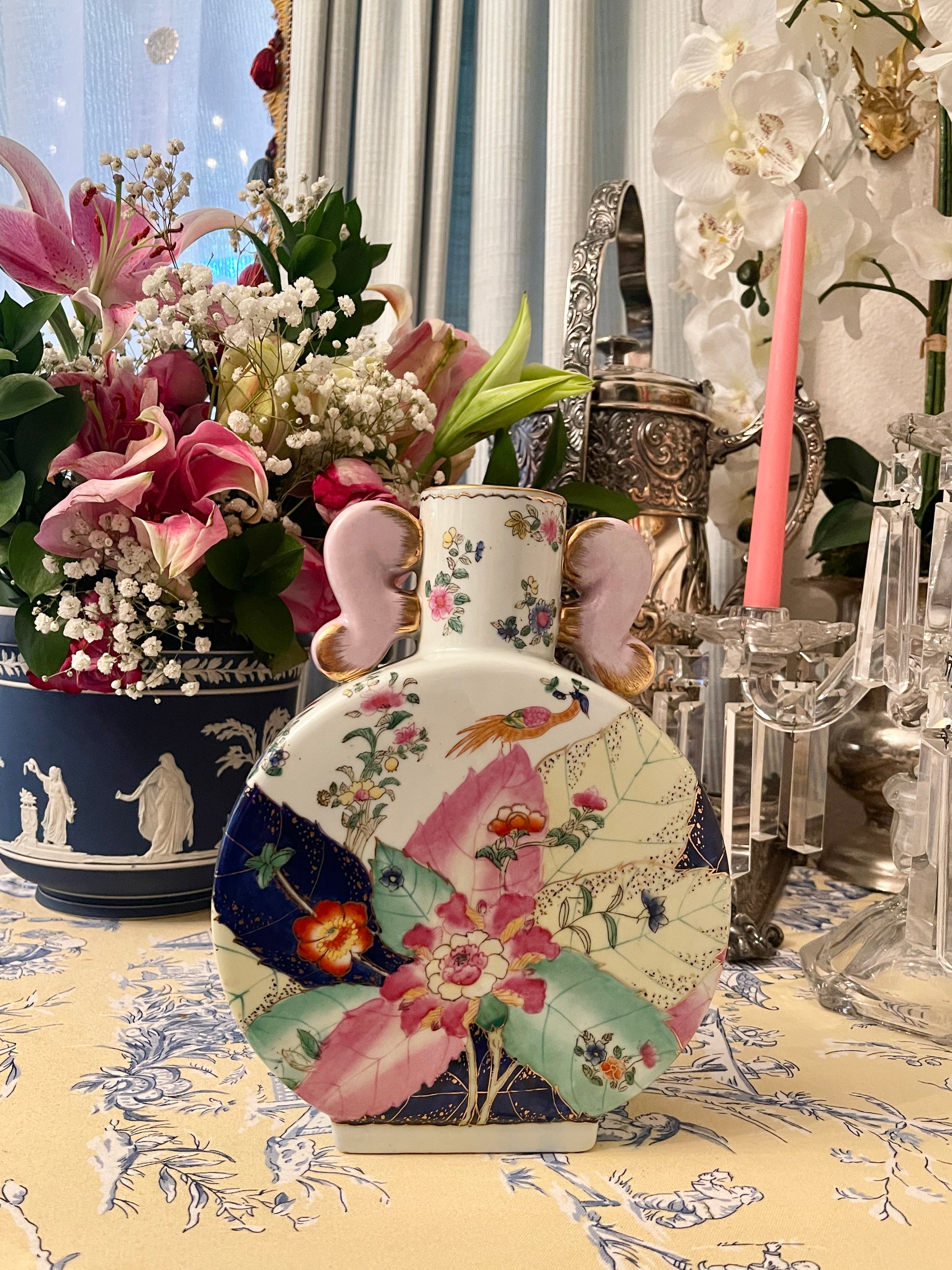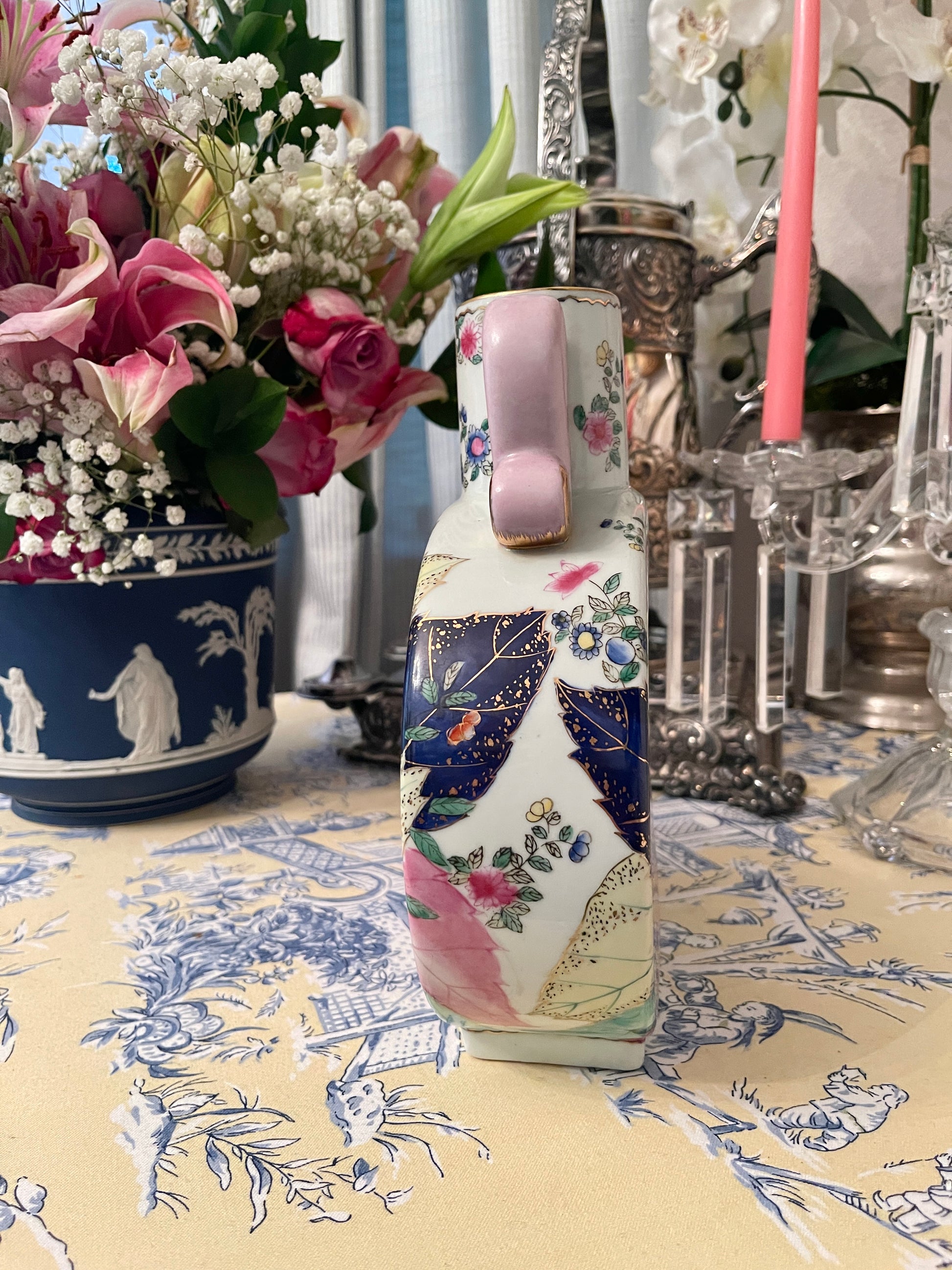 This stunning United Wilson Tobacco Leaf Moon Flask or Vase is a first for me. Beautifully hand painted in vibrant shades of blue, pink, and green with the chinoiserie phoenix atop one of the leaves in this glorious tobacco leaf design. The large scrolling pink handles with gold accents adds that extra touch showing the superb quality of this piece. Marked UW 1891 on the reverse.
