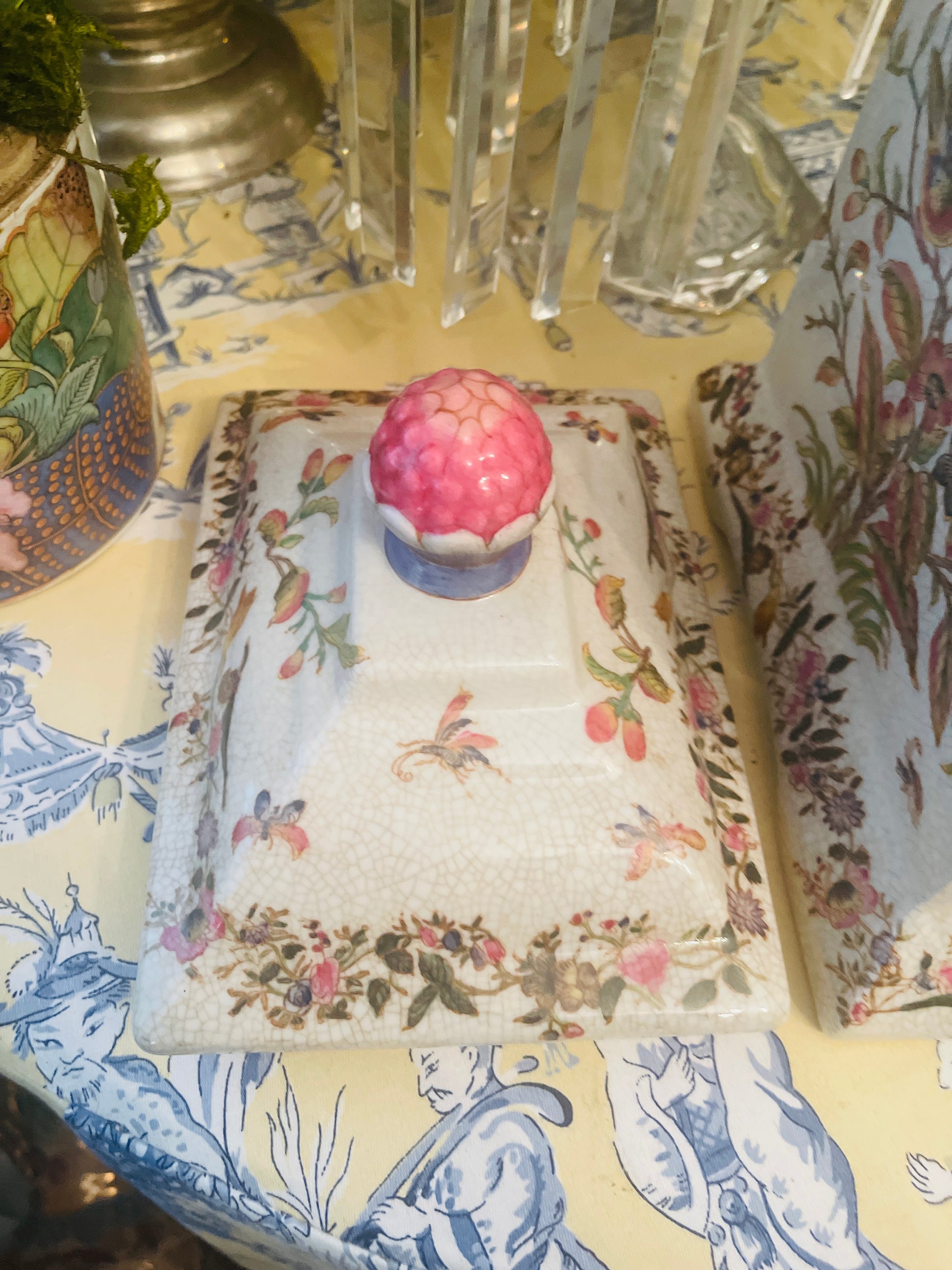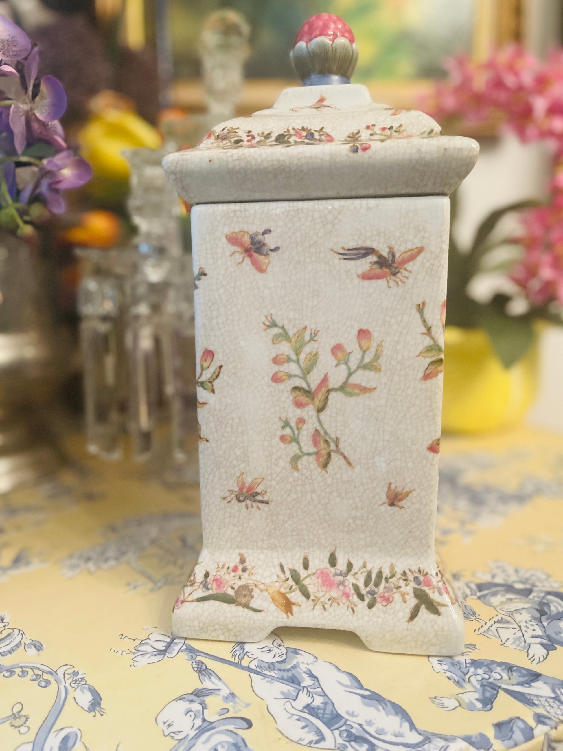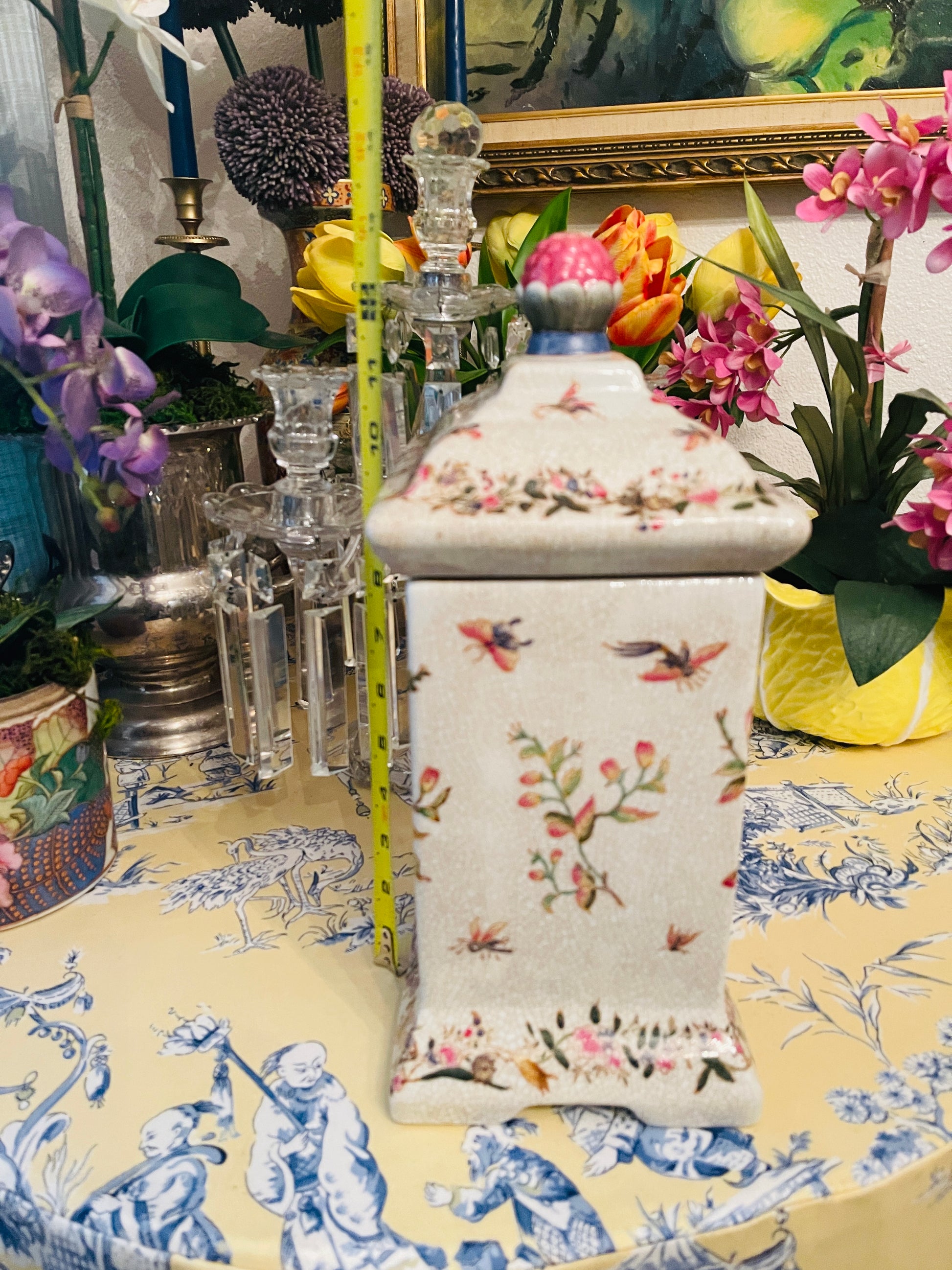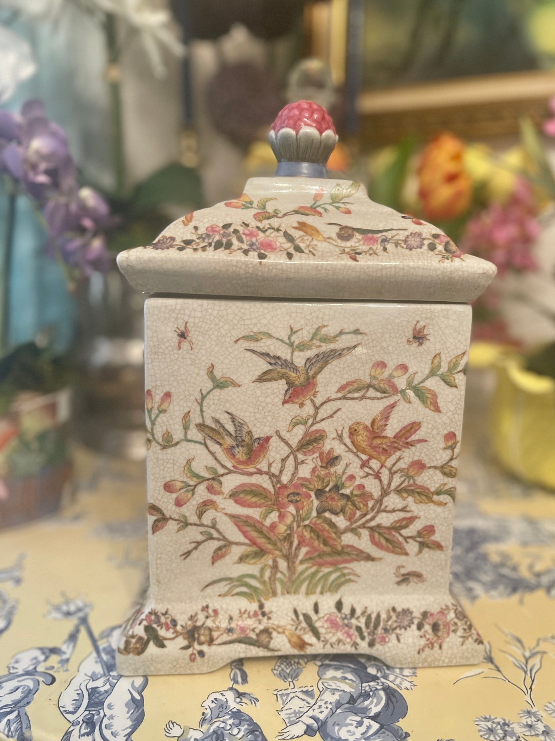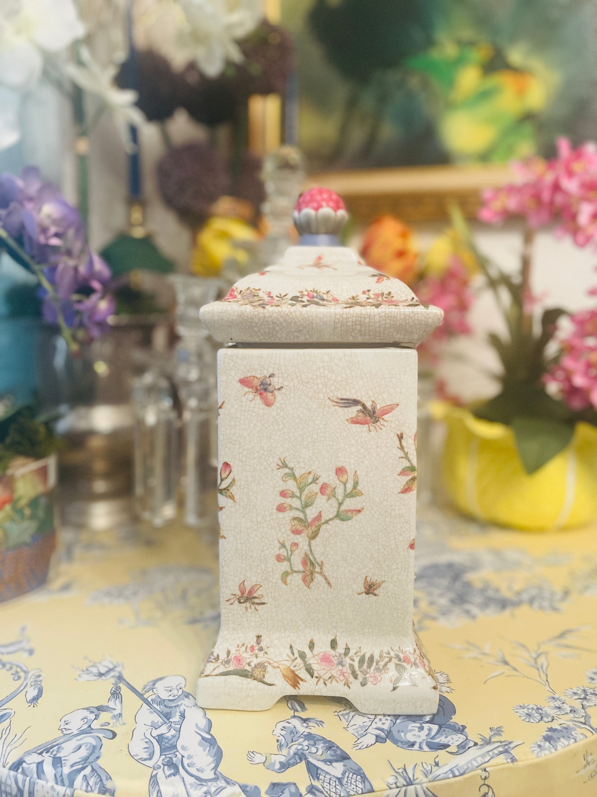Vibrantly colored birds and butterflies with foliage against a crackled background give it a touch of old world charm, with a bloom on top forming a finial/handle on top.