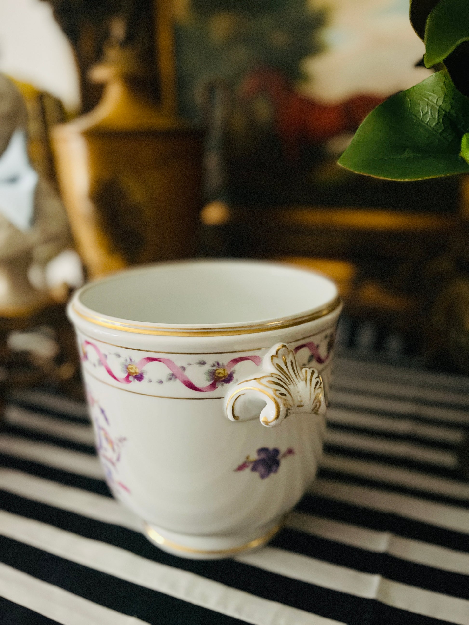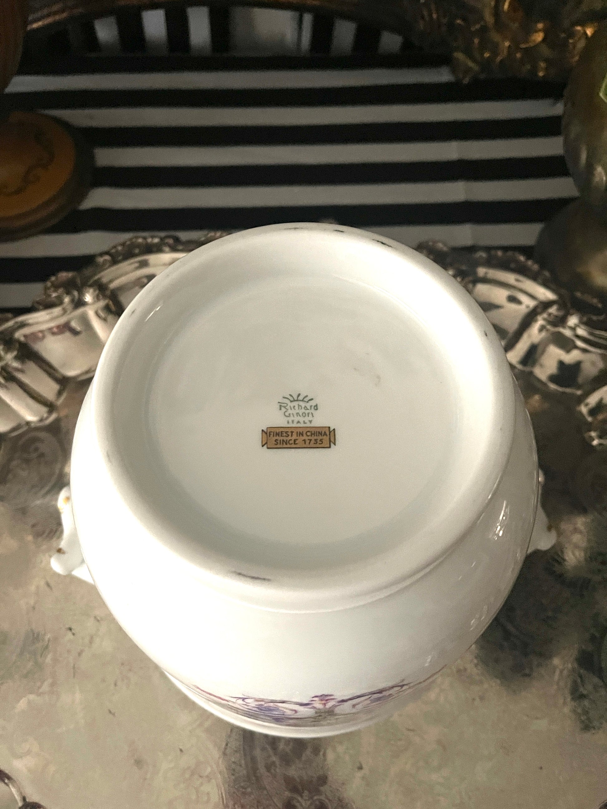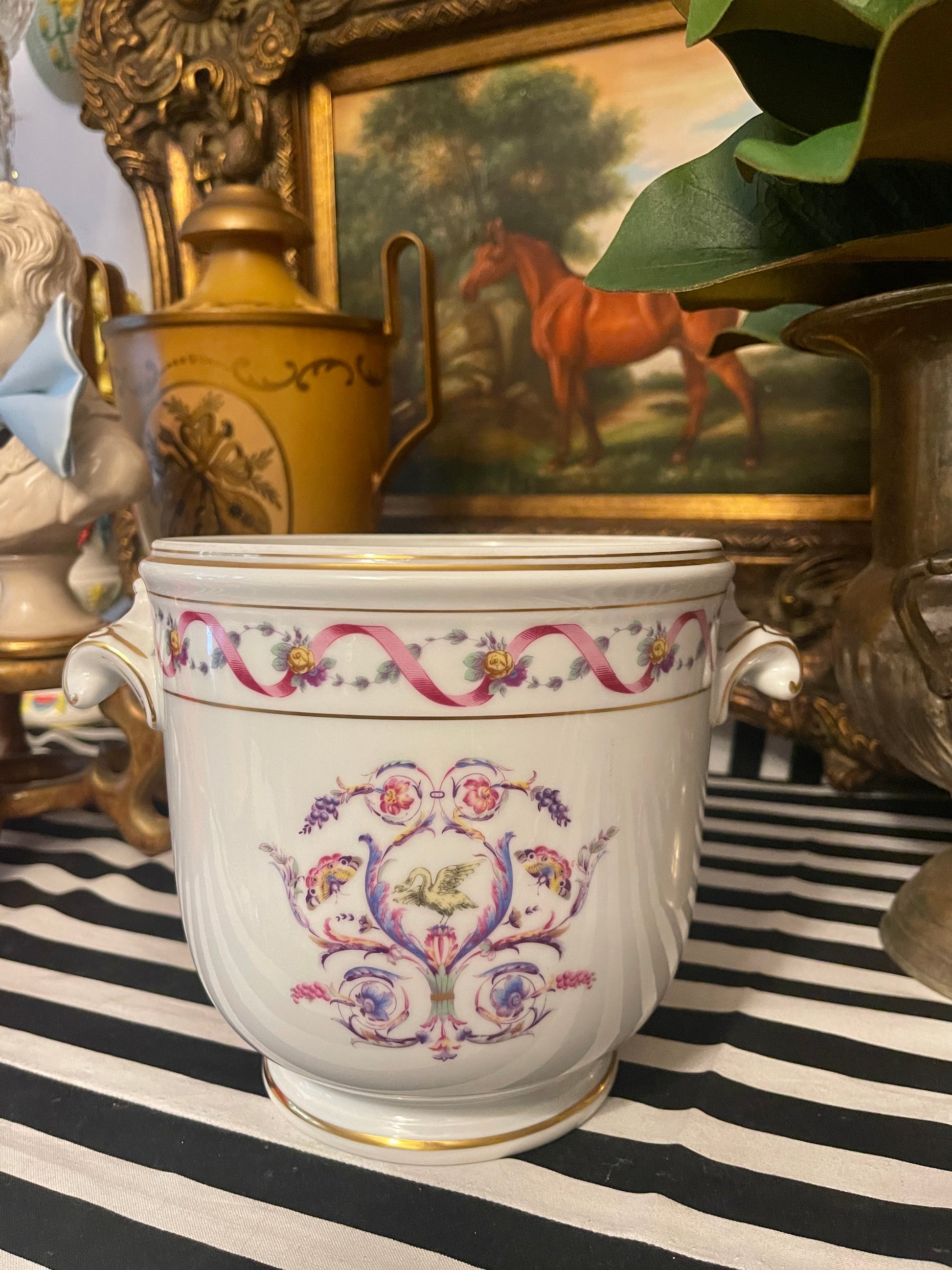 Vintage jardiniere in this glorious Rapallo pattern by Richard Ginori. Made in Italy, it is a vision with pink ribbon bordering purple and yellow florals and butterflies with a light celadon colored bird in the center. Gold details the top and the fantastic shell handles. Marked Richard Ginori Italy Finest China since 1735. It’s in near pristine condition.
