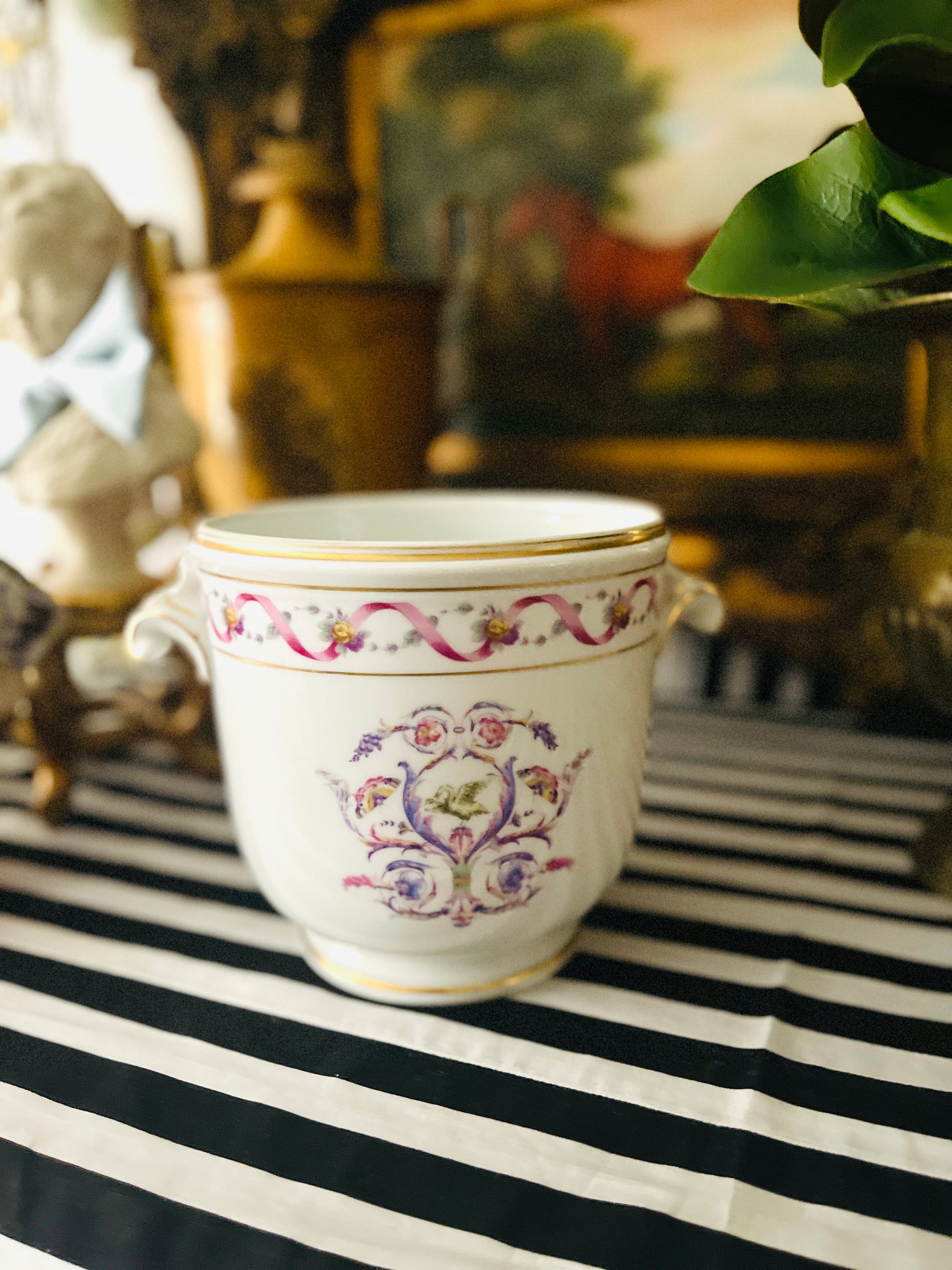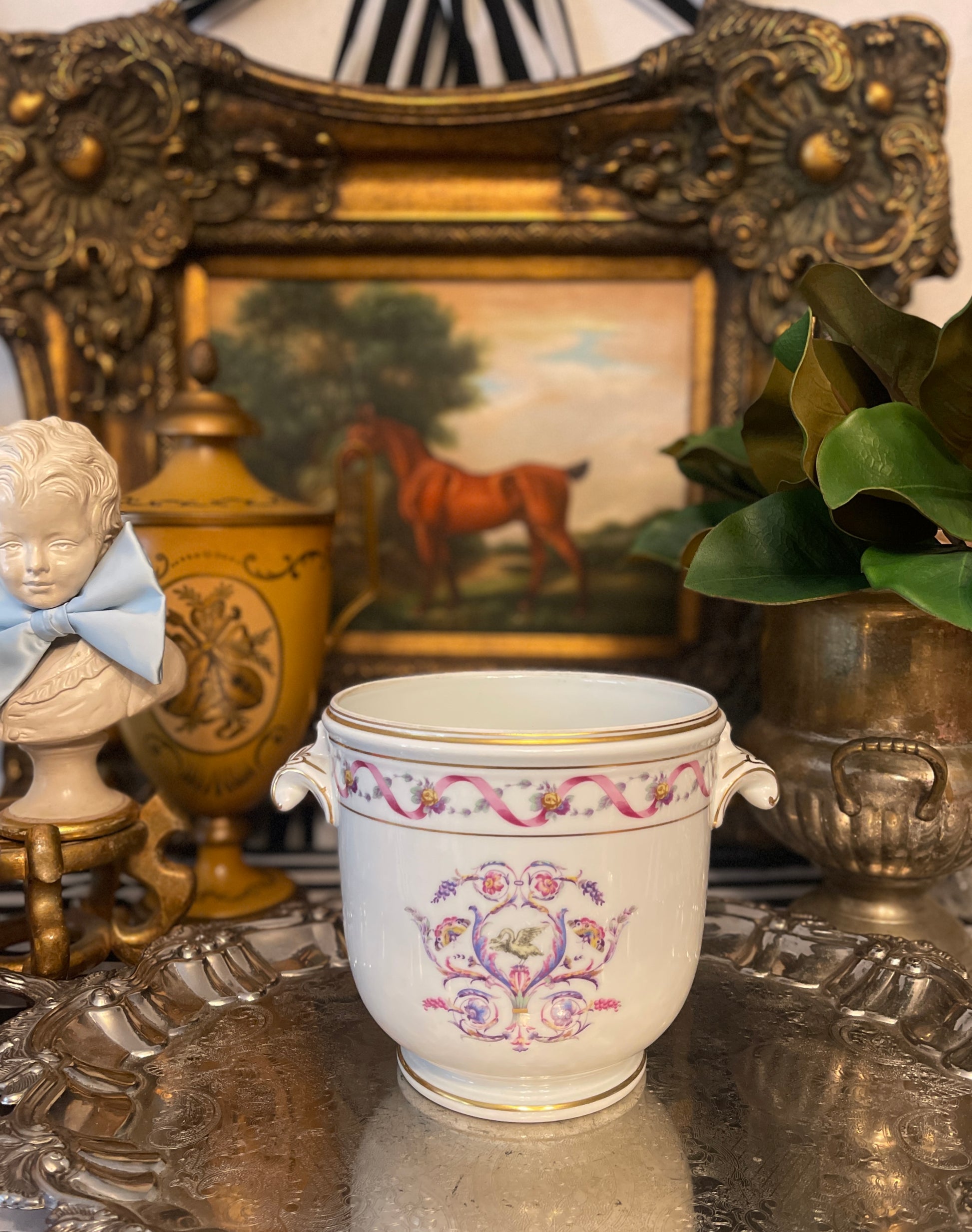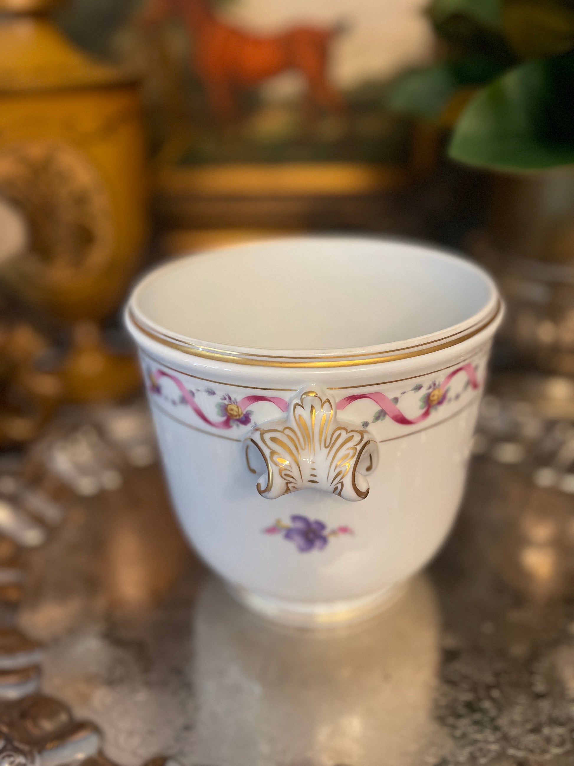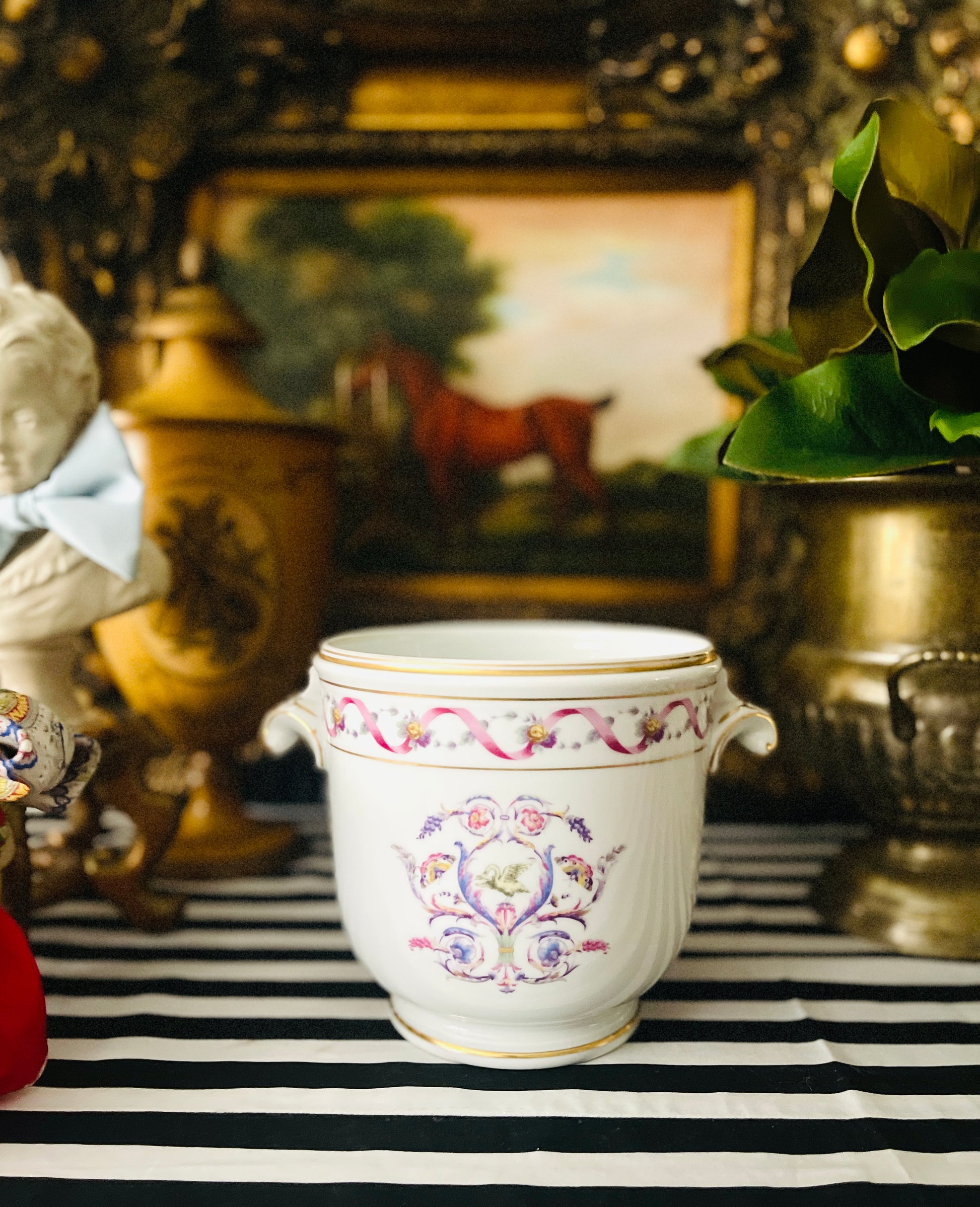 Vintage jardiniere in this glorious Rapallo pattern by Richard Ginori. Made in Italy, it is a vision with pink ribbon bordering purple and yellow florals and butterflies with a light celadon colored bird in the center. Gold details the top and the fantastic shell handles. Marked Richard Ginori Italy Finest China since 1735. It’s in near pristine condition.
