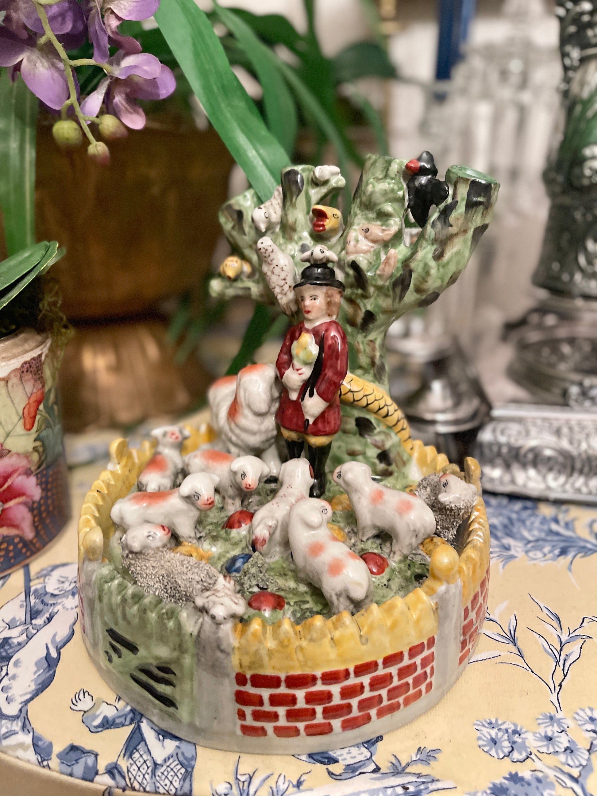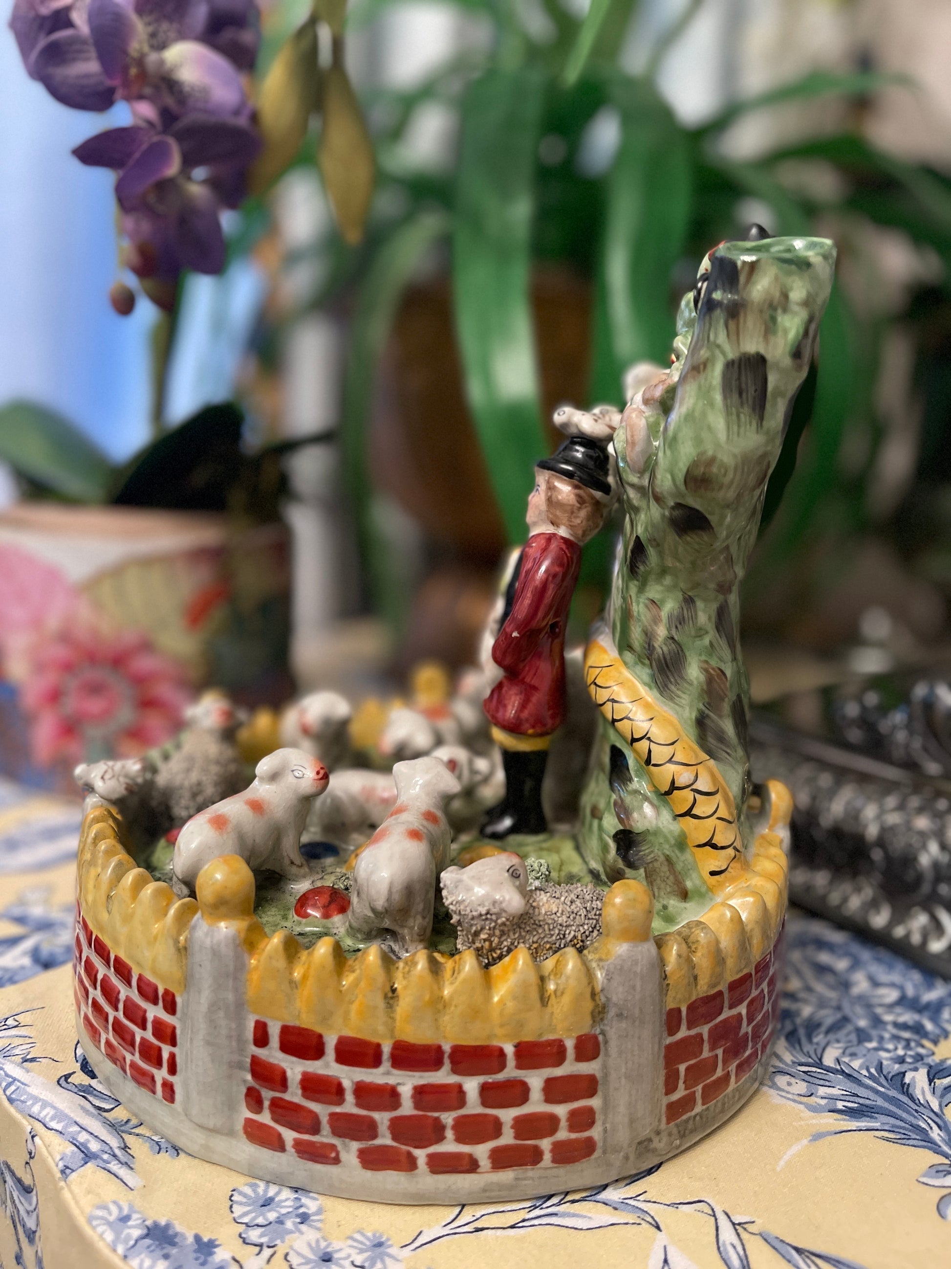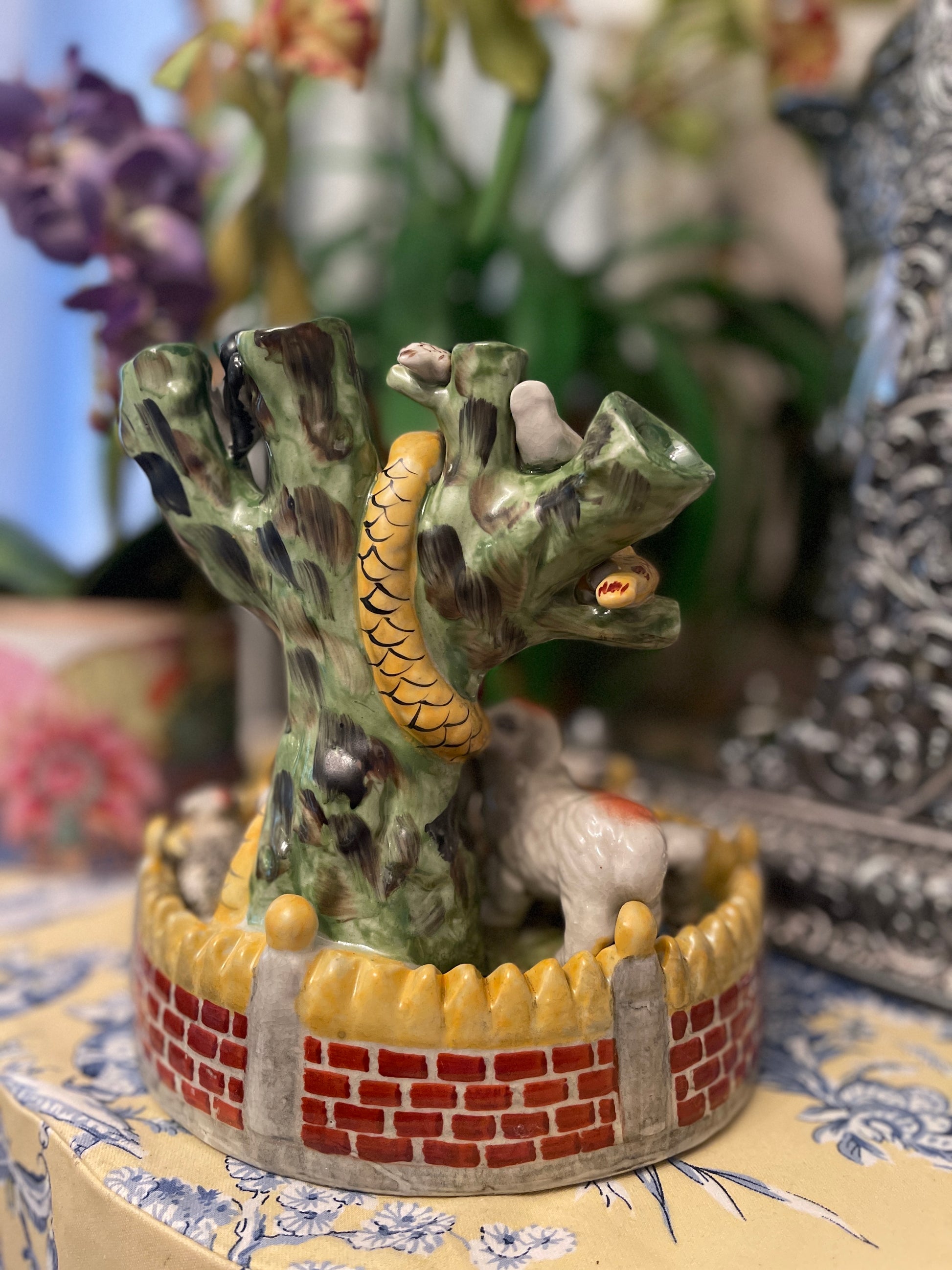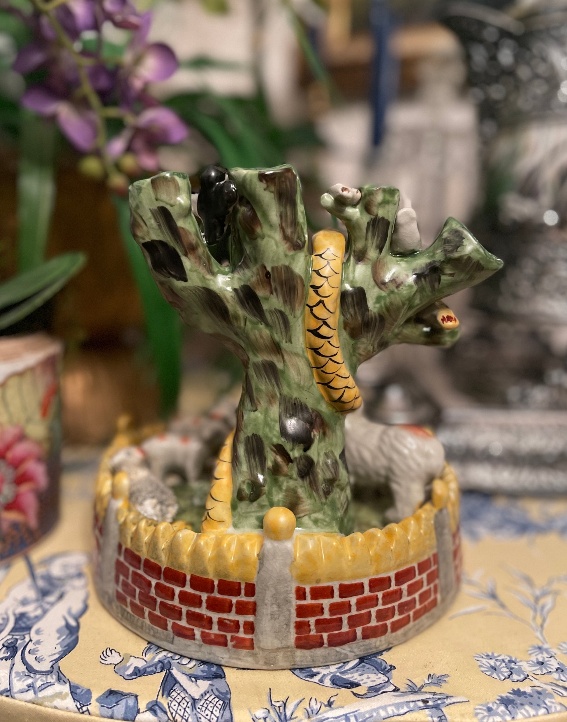Large vintage Staffordshire style Spill vase with a shepherd and his herd of sheep in front of a large central hollow tree. The branches hold several oversized perched birds and the head of a large yellow snake pokes through with the body wrapping around it. The base is made to look brick fence with a picket gate.