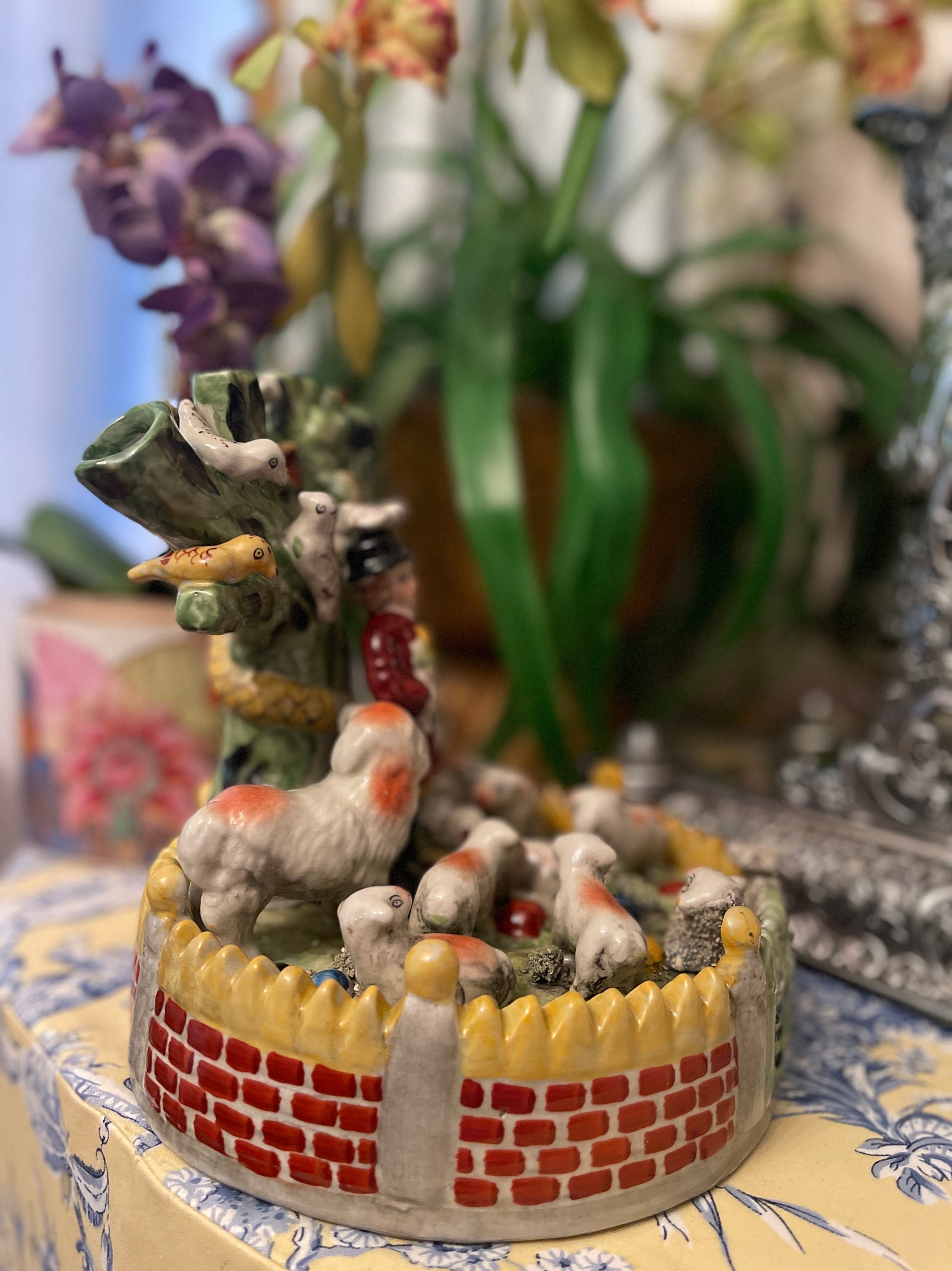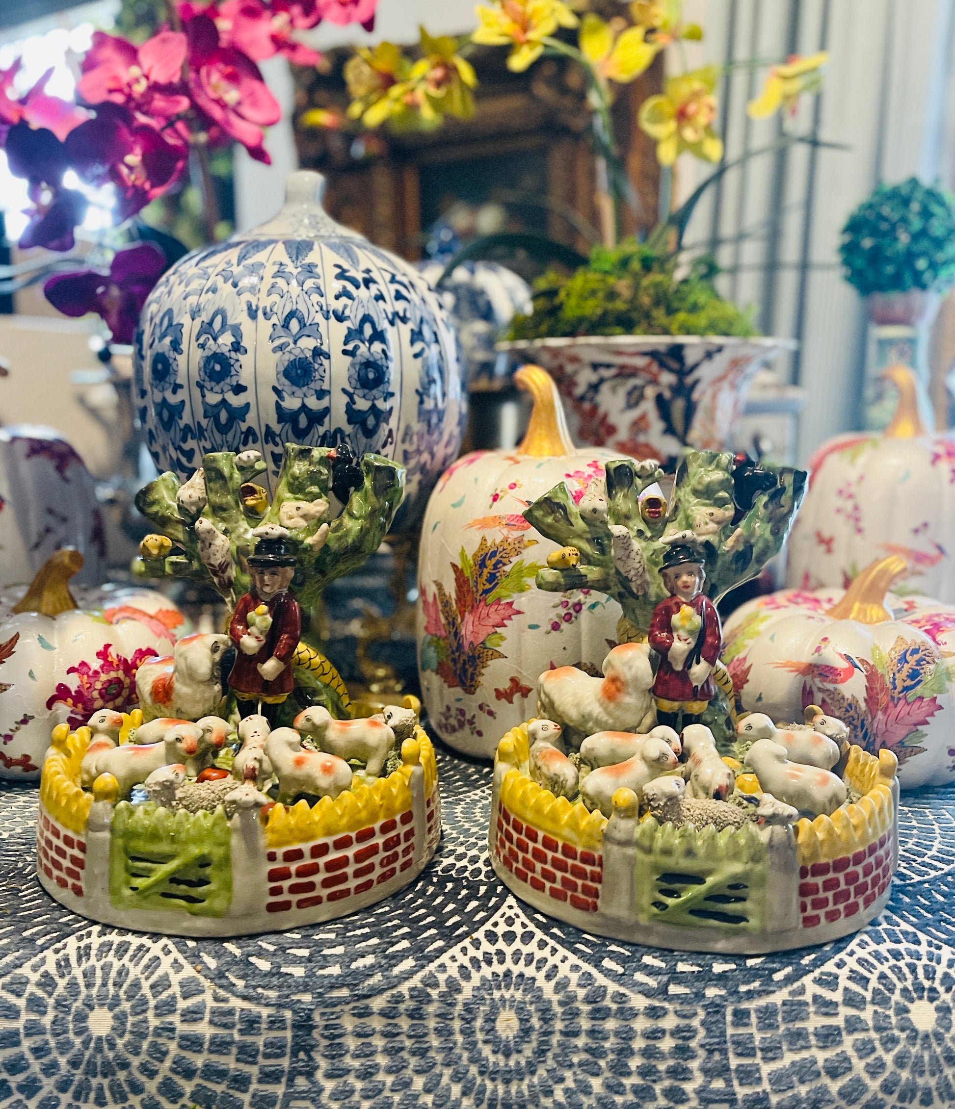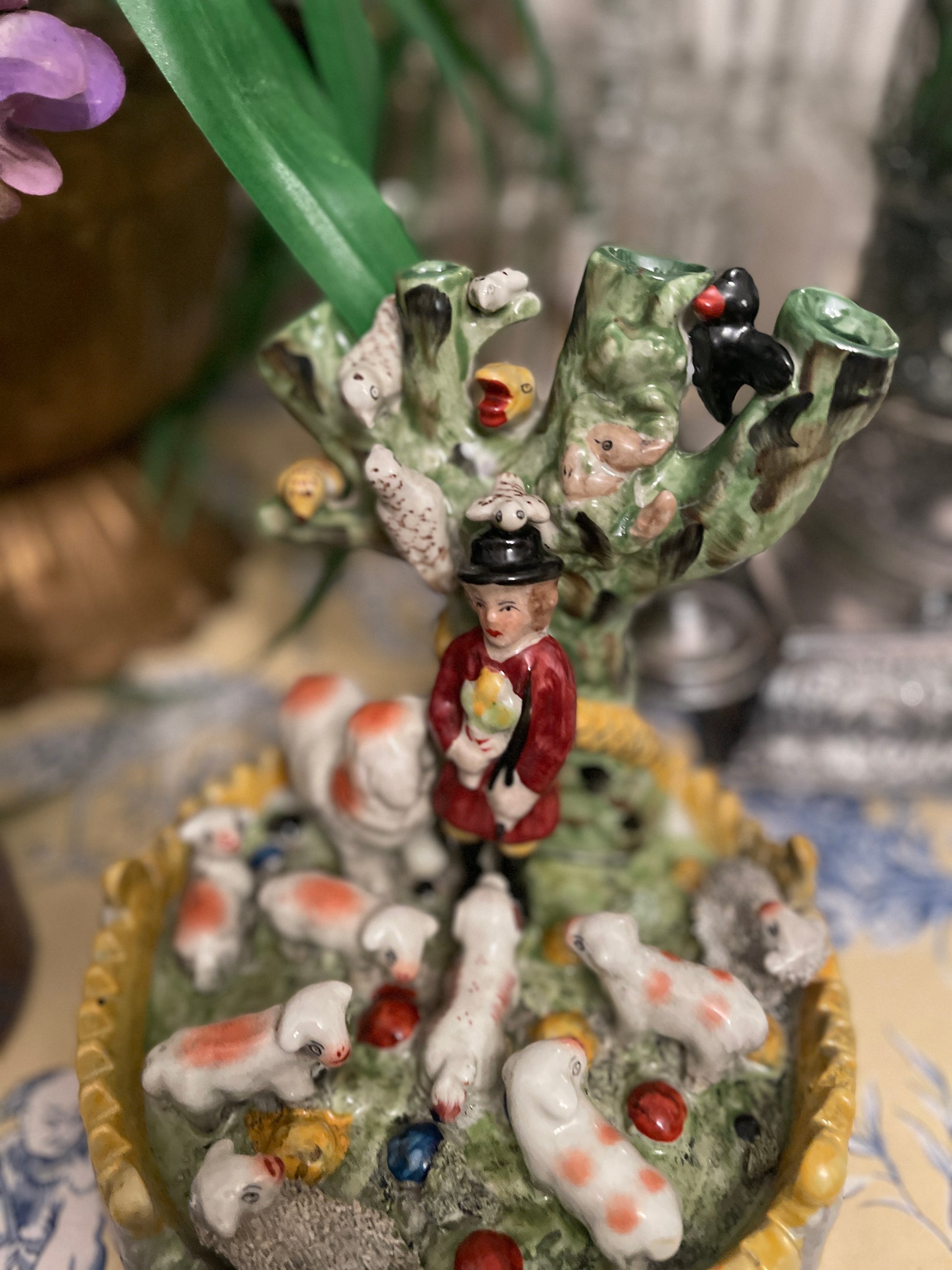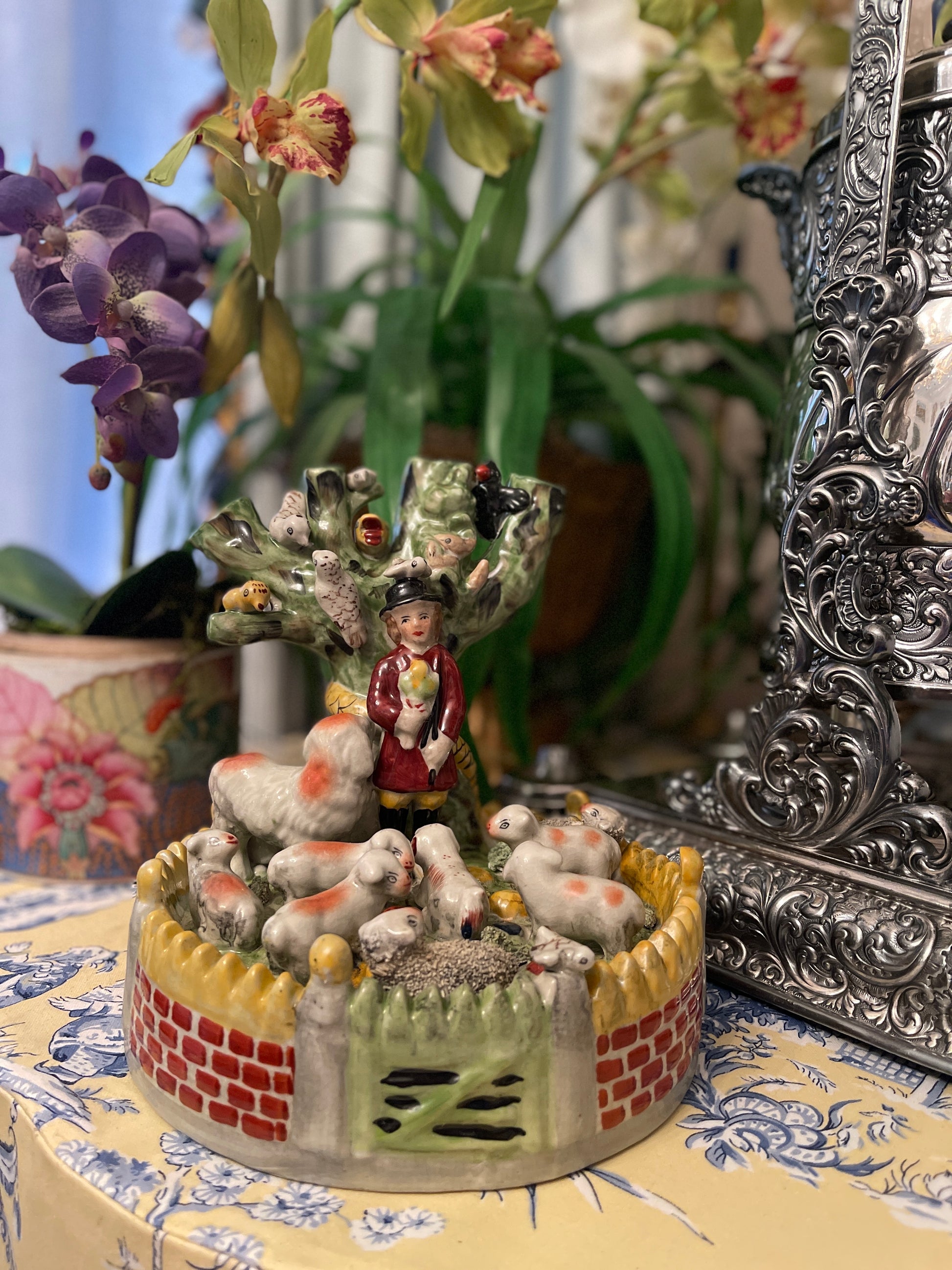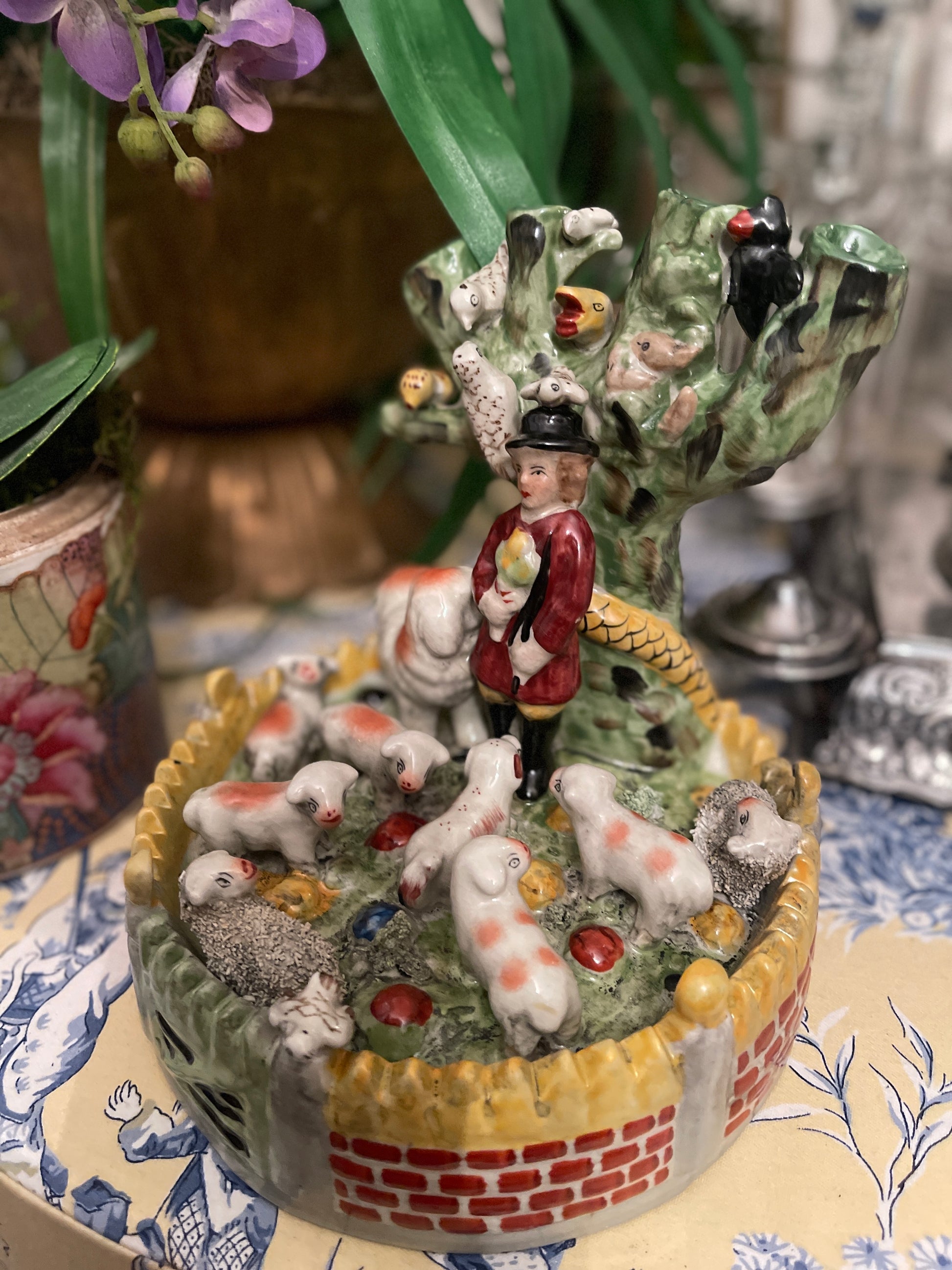 Large vintage Staffordshire style Spill vase with a shepherd and his herd of sheep in front of a large central hollow tree. The branches hold several oversized perched birds and the head of a large yellow snake pokes through with the body wrapping around it. The base is made to look brick fence with a picket gate.