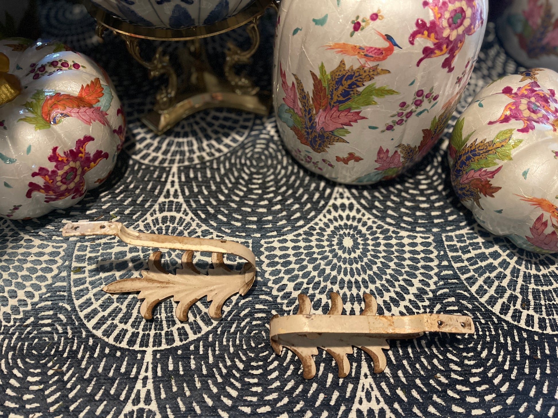Pair of vintage shabby chic cream possibly dusty pink Tole Tie Backs. Re-paint or use as-is.