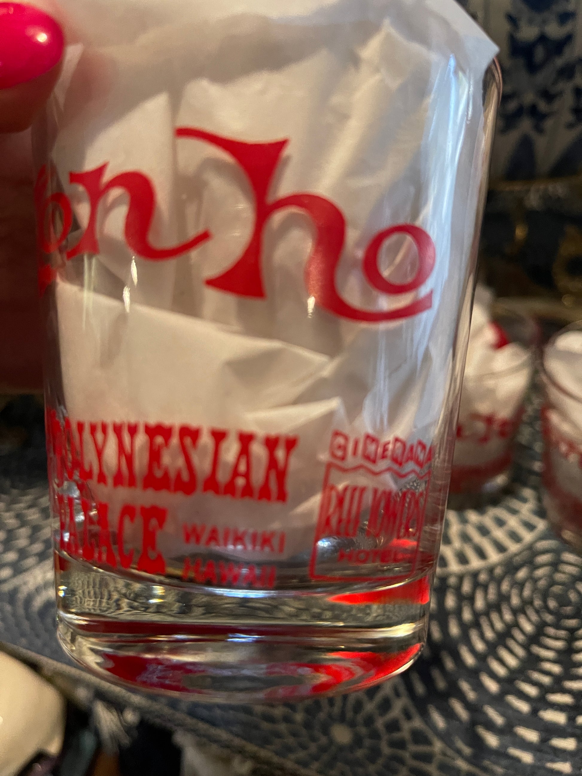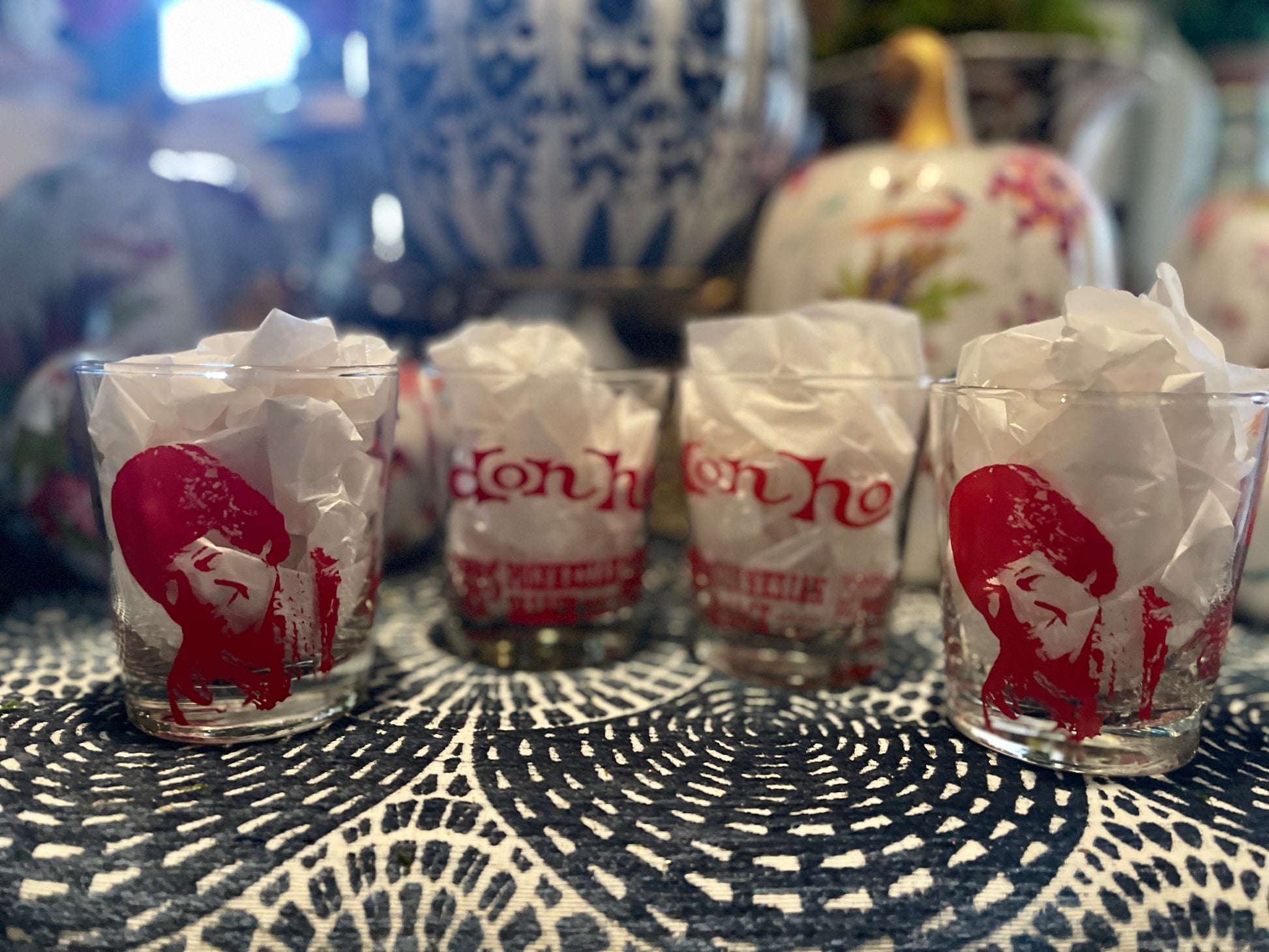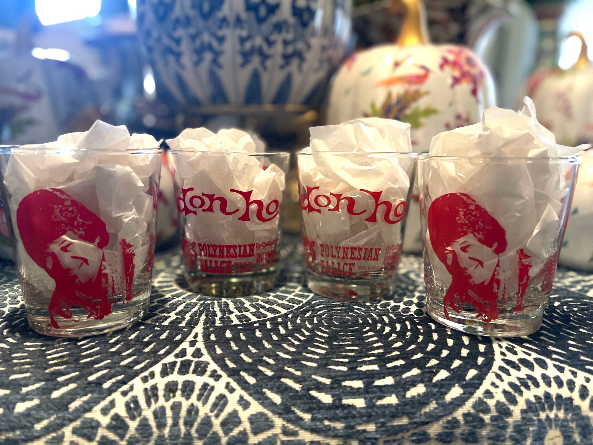 Can’t you hear Tiny Bubbles?? This set of four Don Ho Hawaiian Polynesian Palace lowball glasses will bring a smile to your face every time you see them. Made by Libbey, they’re such fantastic pieces to add to a bar cart or wet bar.