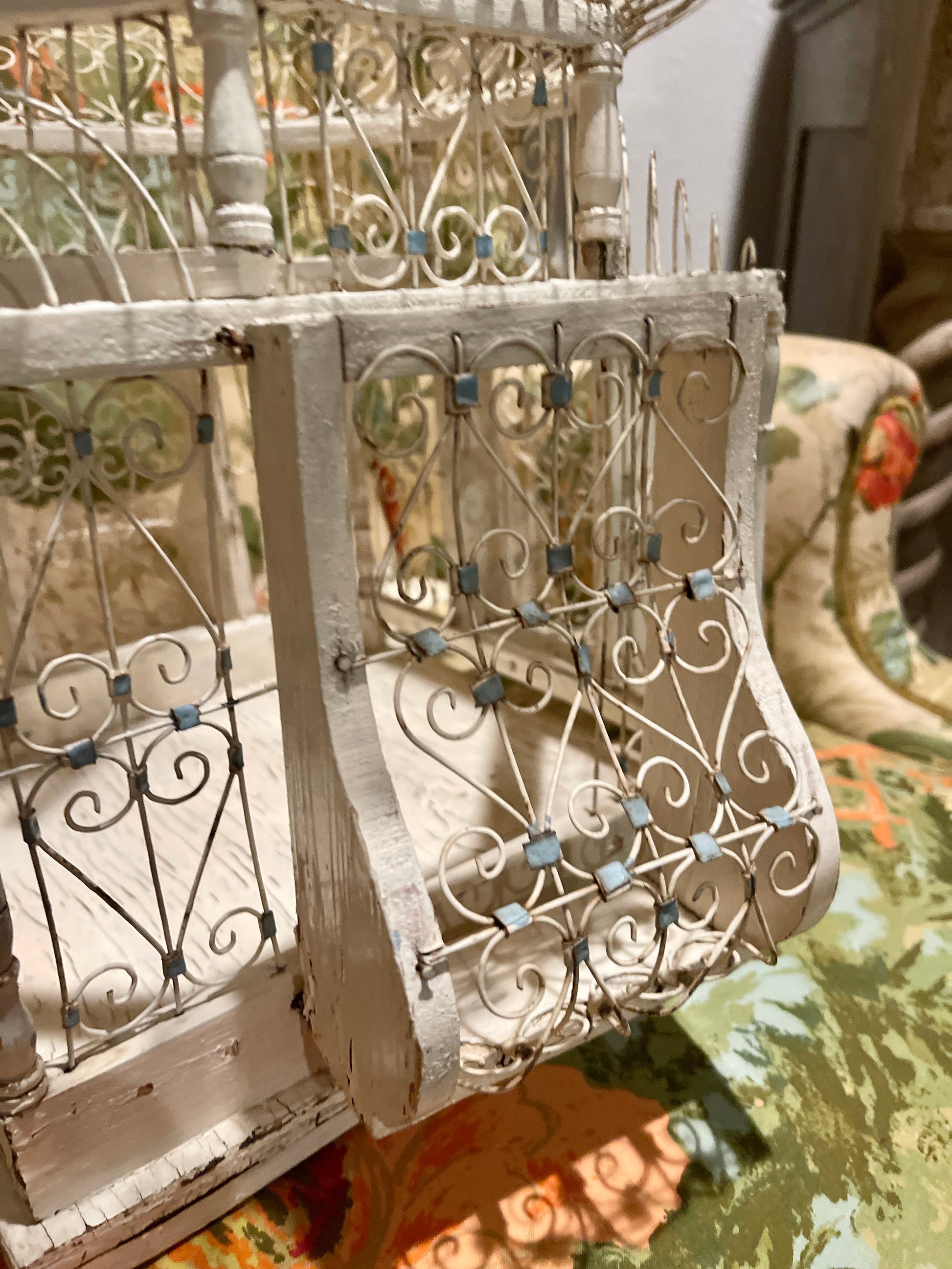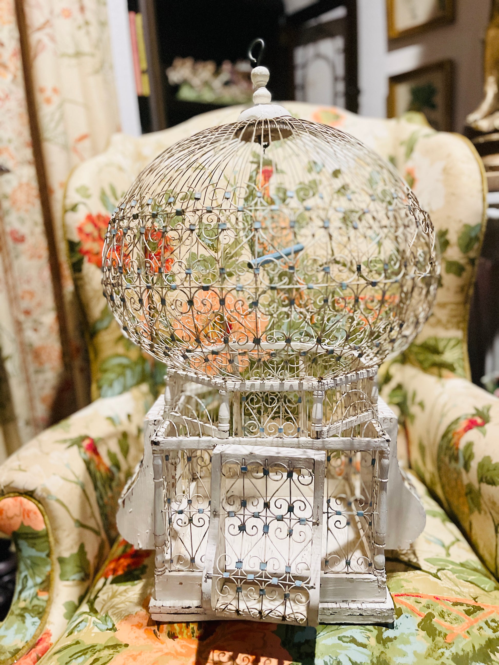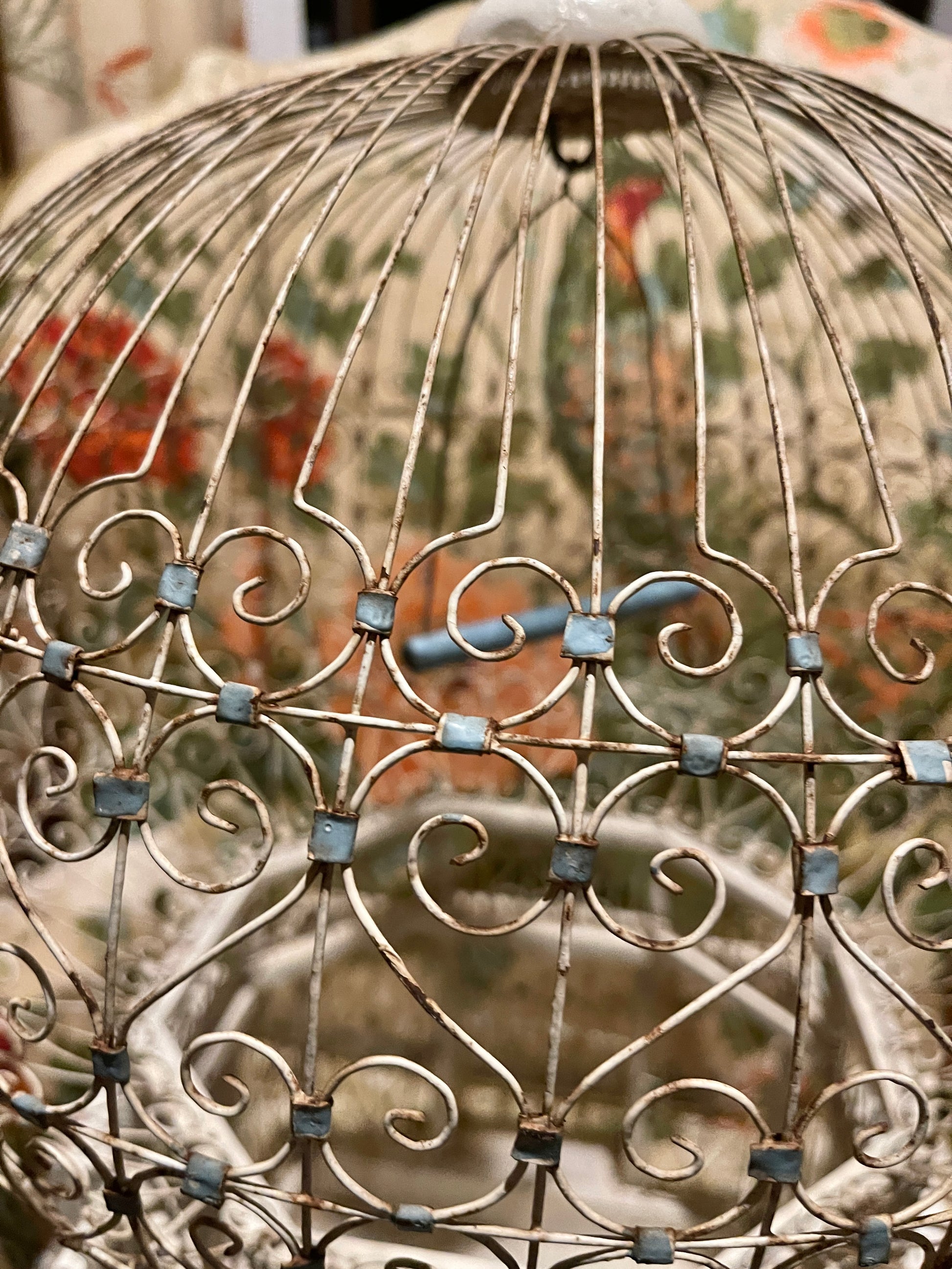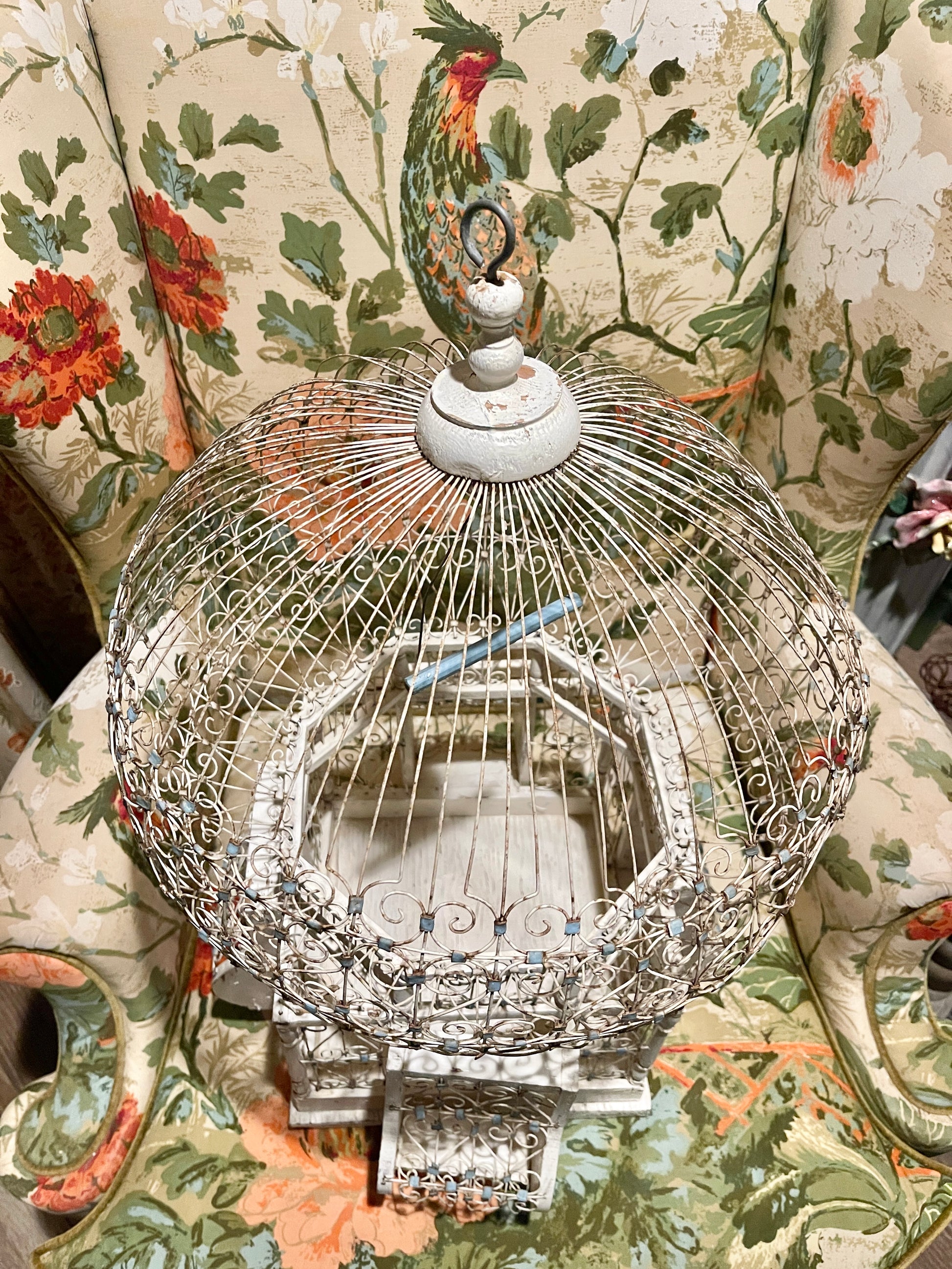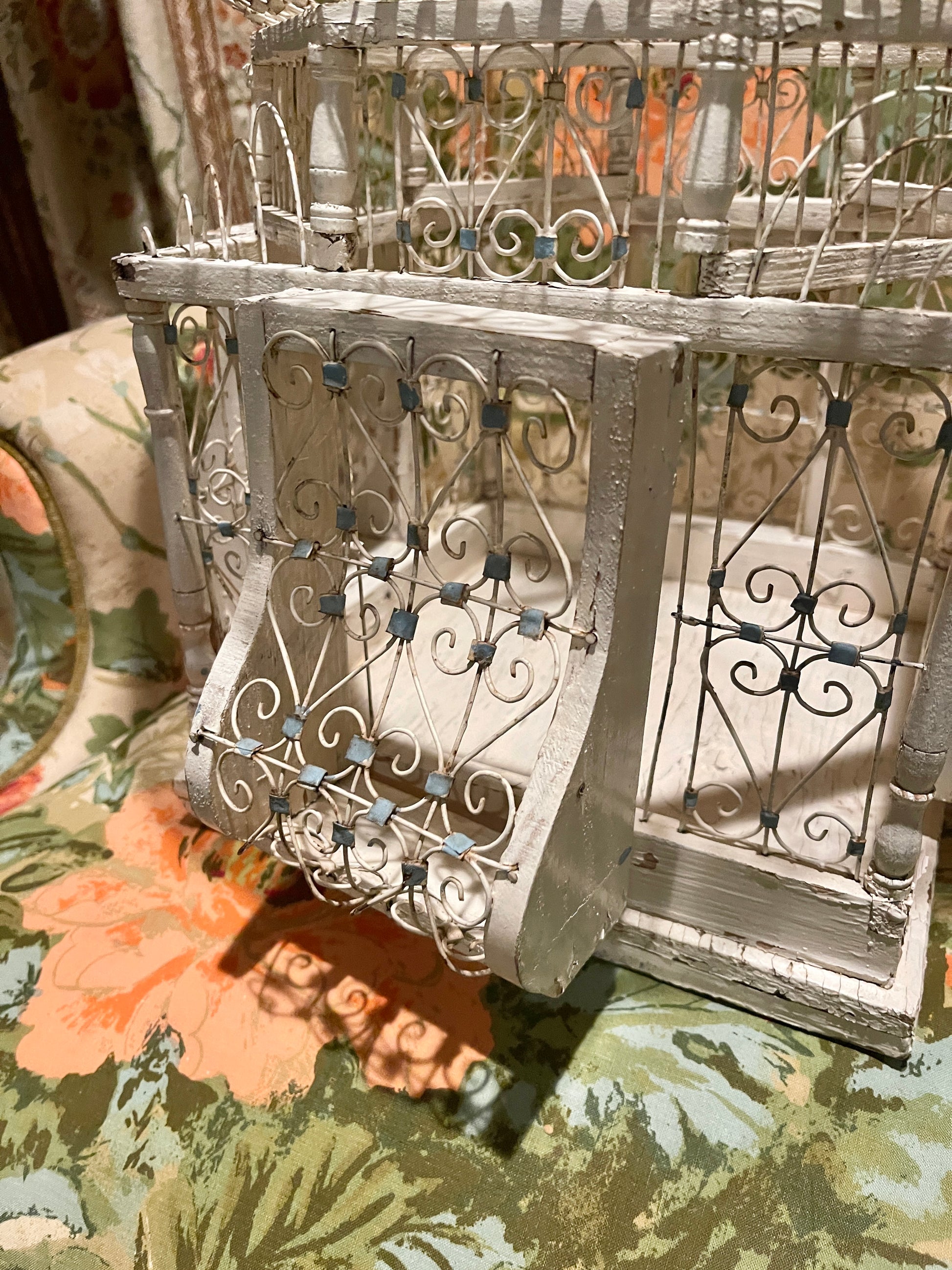 To say that I'm completely OBSESSED with this Victorian style tole balloon bird cage with chippy white wood and blue accents is a huge understatement. It’s so perfectly imperfect with an antique French vibe that's beyond charming. That blue swing pushes me over the edge, lol.