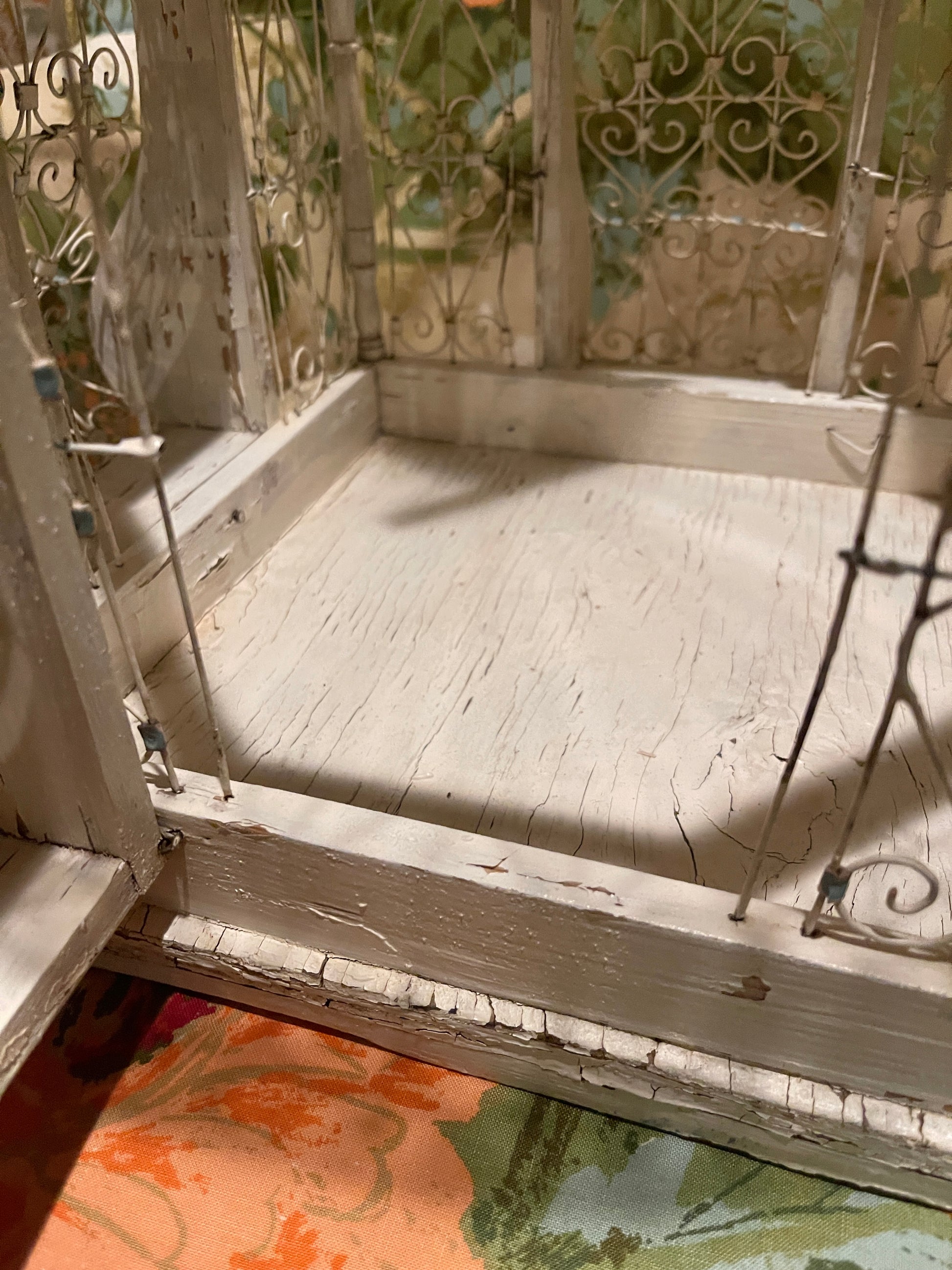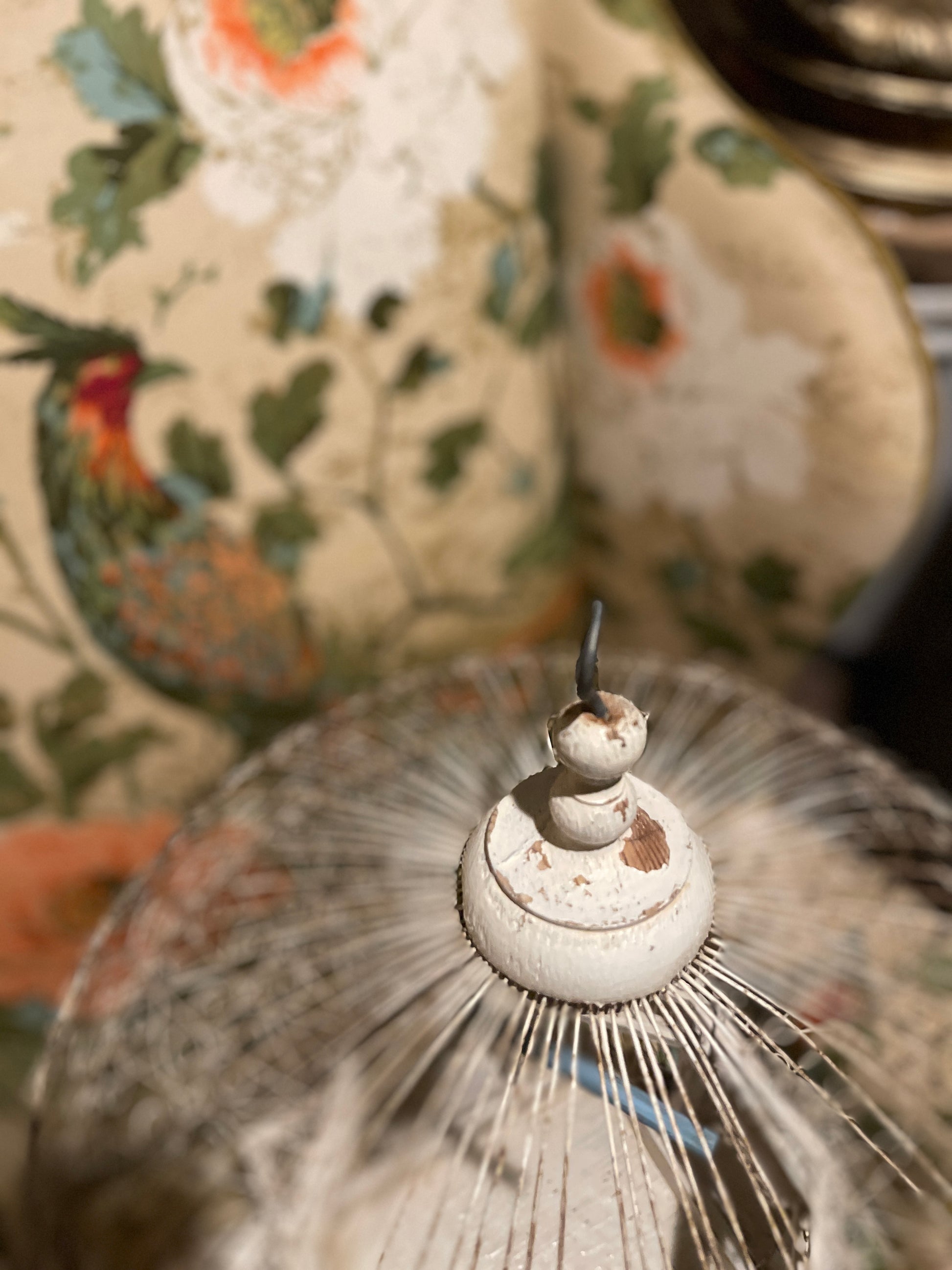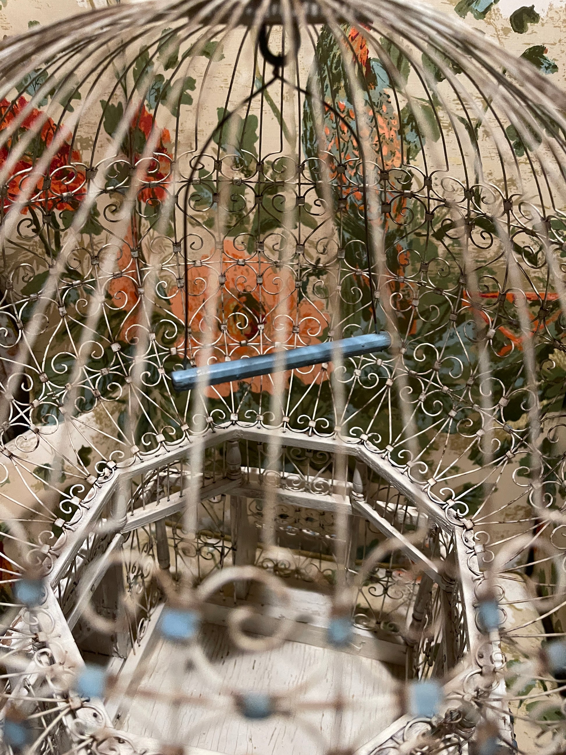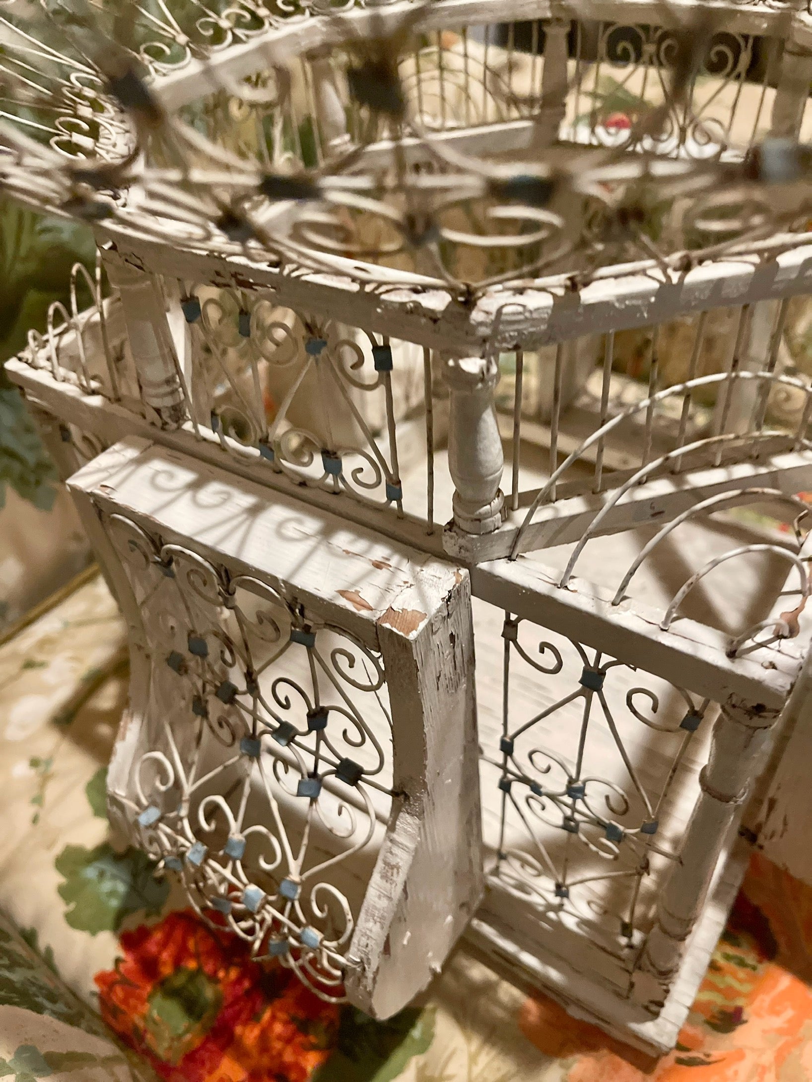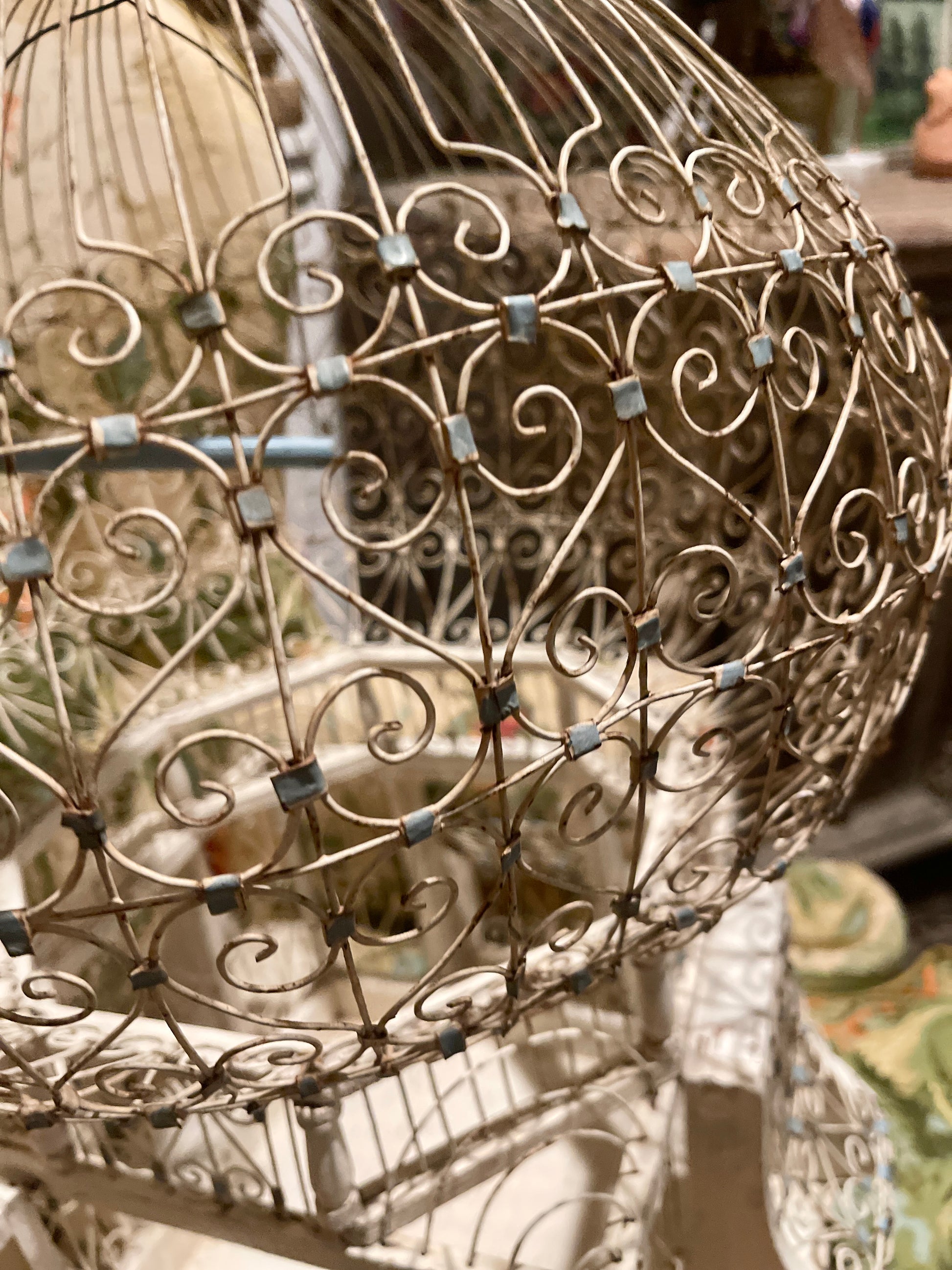 To say that I'm completely OBSESSED with this Victorian style tole balloon bird cage with chippy white wood and blue accents is a huge understatement. It’s so perfectly imperfect with an antique French vibe that's beyond charming. That blue swing pushes me over the edge, lol.