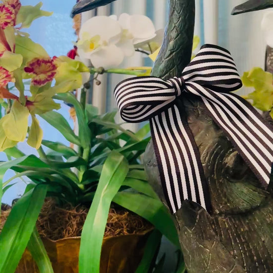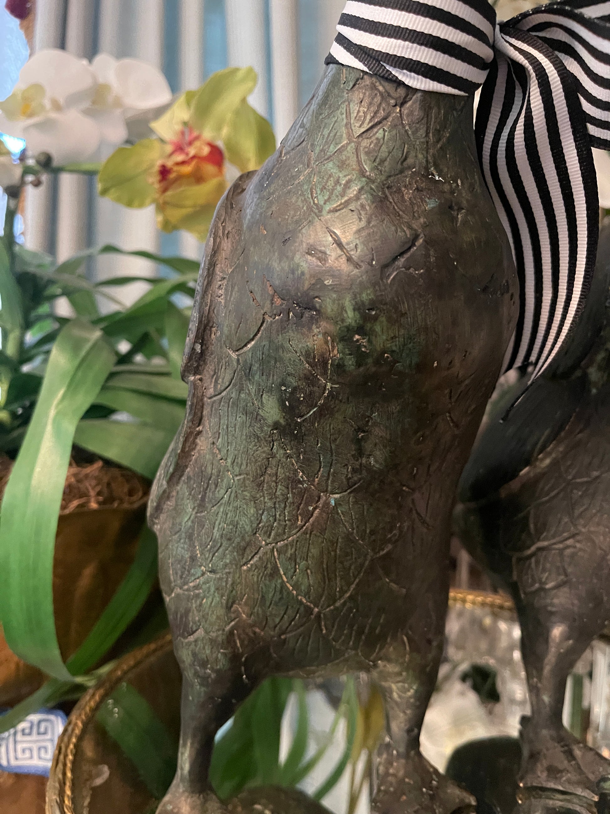 Perfect alone or as a complementary pair, each goose sits atop a sturdy base and showcases a darkened verdigris finish that only decades of age can achieve. They’re stunning styled with ribbons, greenery, or seasonal décor.