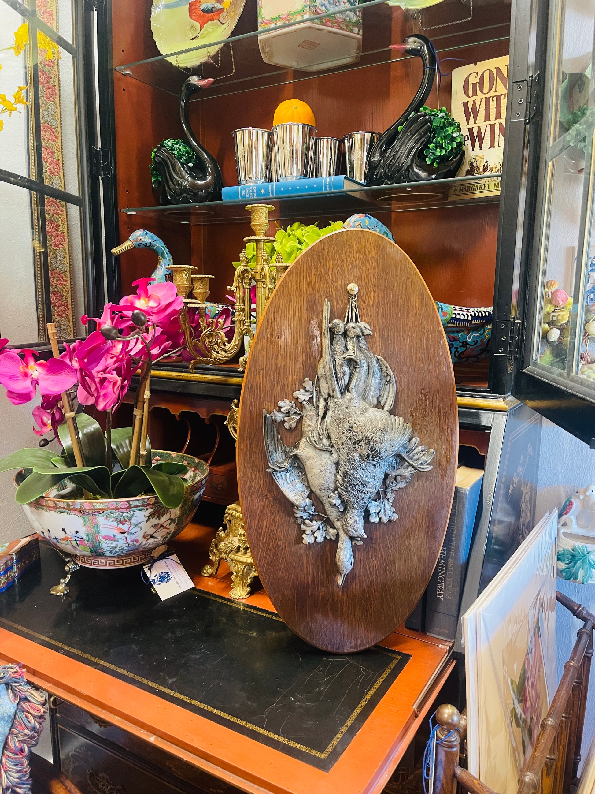 This is truly FANTASTIC! Bring a touch of stately sporting elegance to your space with this dramatic vintage cast metal hunt trophy plaque. Mounted on a rich, oval wood backboard, this sculptural wall piece features exquisitely detailed game birds—hung in traditional trompe l’oeil style—rendered in a deep silver-toned cast metal. The texture and lifelike drama evoke classic European sporting lodge décor, blending seamlessly with English country, gentleman’s study, or maximalist grandmillennial interiors. I believe to be Germa. Marked HB, I believe.