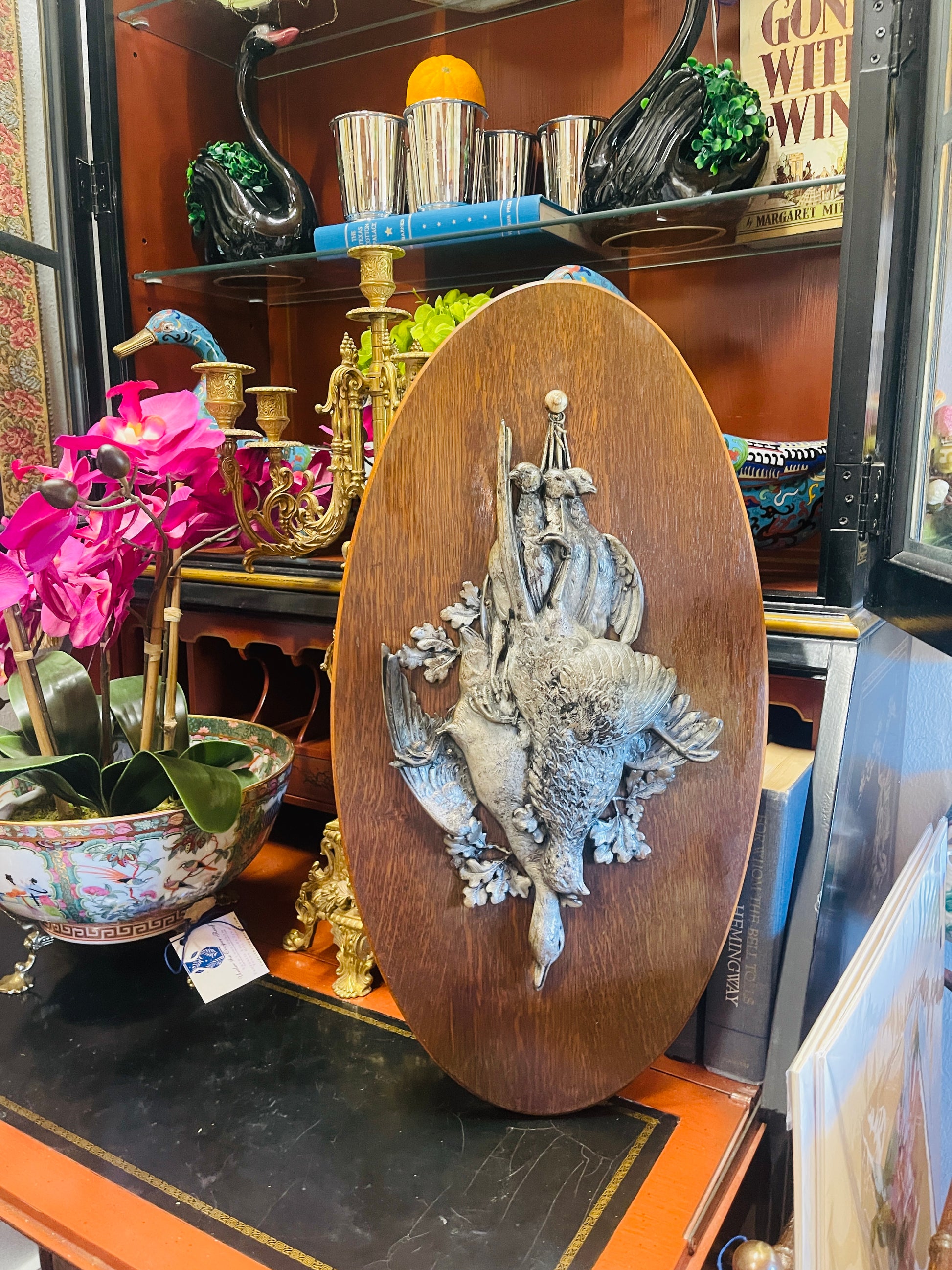 Vintage Cast Metal Hunt Trophy Plaque – Game Bird Wall Mount on Wood Panel