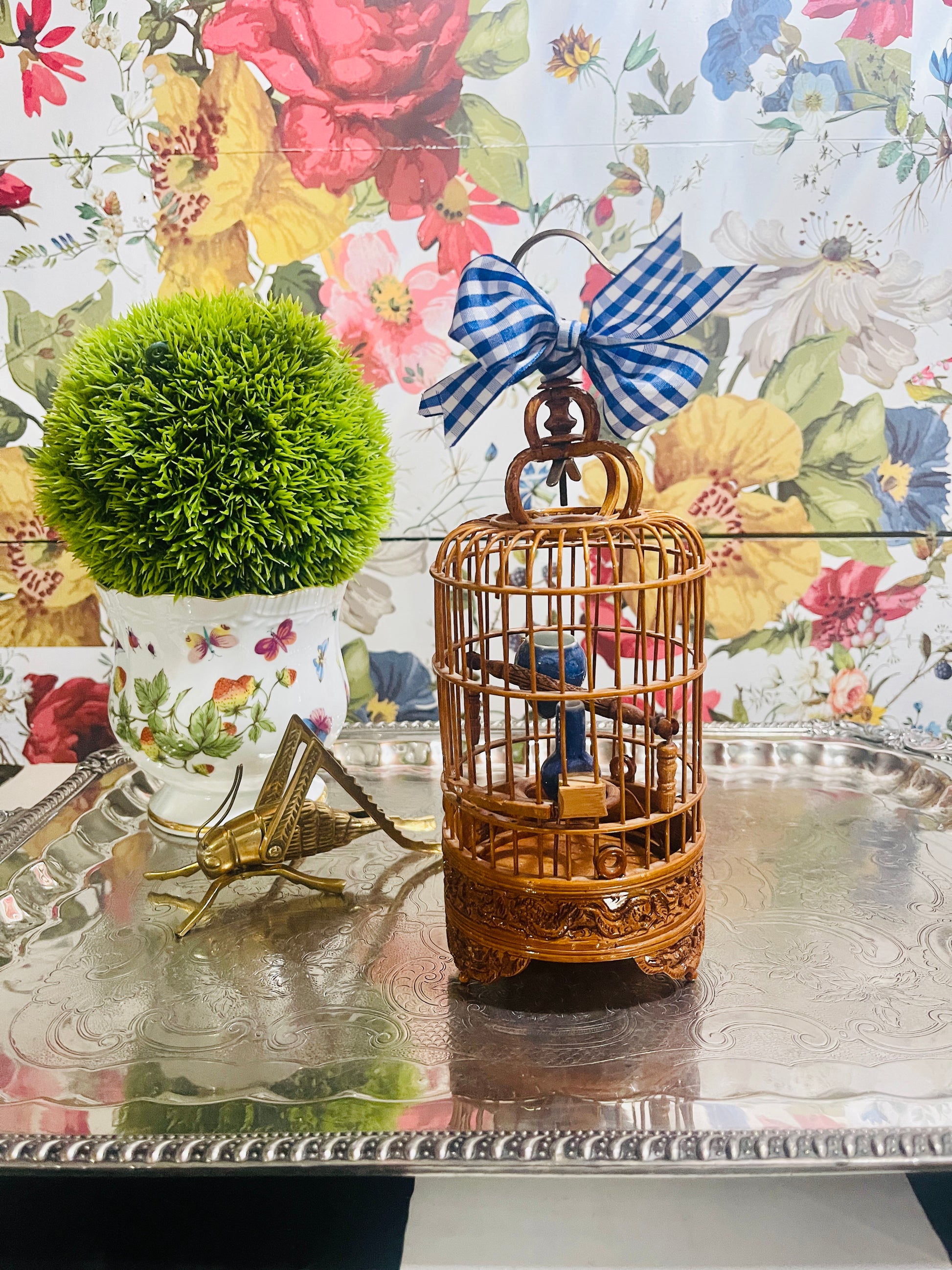Vintage Chinoiserie wood birdcage with blue porcelain pot feeders. Three ornately carved feet. Metal hook for hanging. Blue and white gingham taffeta ( removable) bow. Always a fave estate sale find.
