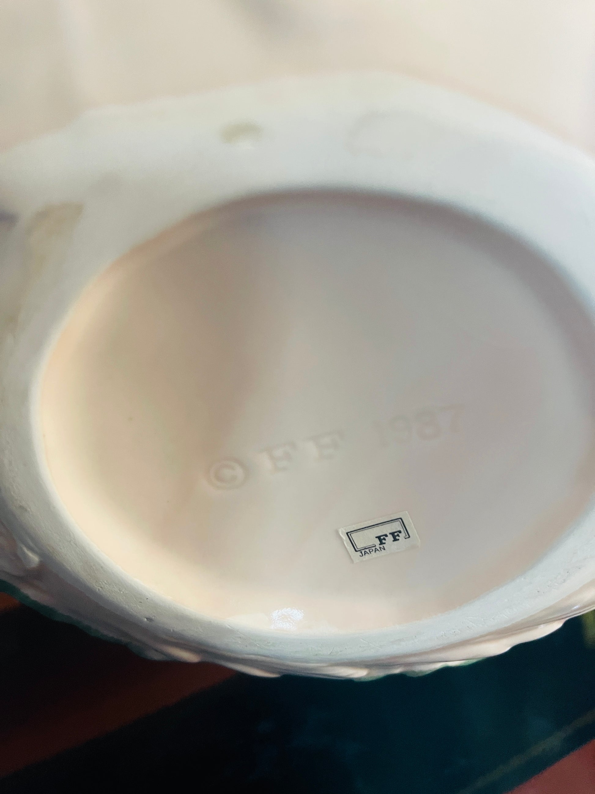 Fantastic vintage Fitz and Floyd Lily of the Valley Centerpiece Bowl. Hand painted swans, cala lilies, and ferns in pink and green make up this palm beach chic piece. Circa 1987. Made in Japan.