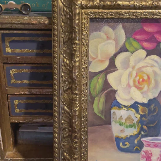 Vintage Floral Still Life Oil Painting — White Blooms in Chinoiserie Vase with Pink Teacup, Ornate Gilt Frame