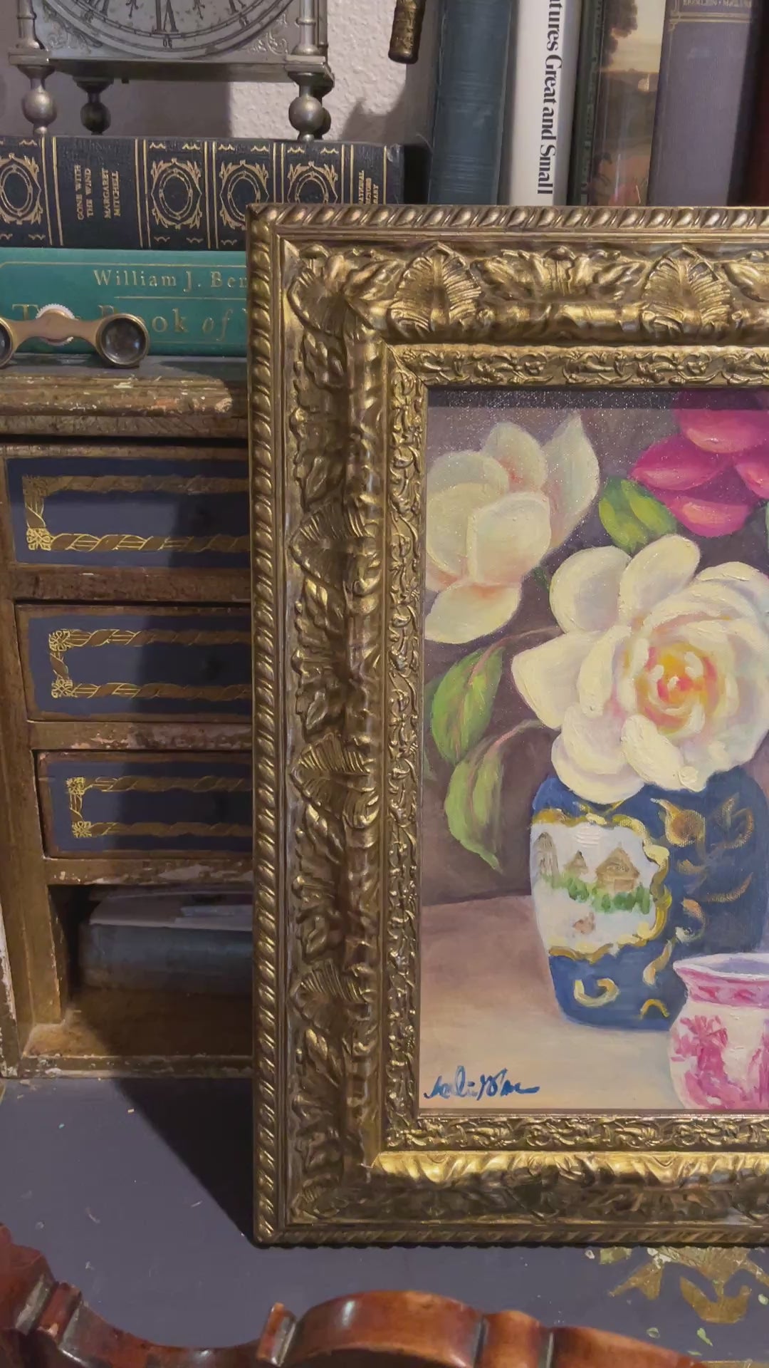 The painting is beautifully presented in an ornate gilt frame with bold carved detailing and a warm aged patina. The frame adds architectural presence and elevates the artwork into a true statement piece—perfect for traditional, grandmillennial, chinoiserie, and collected interiors.