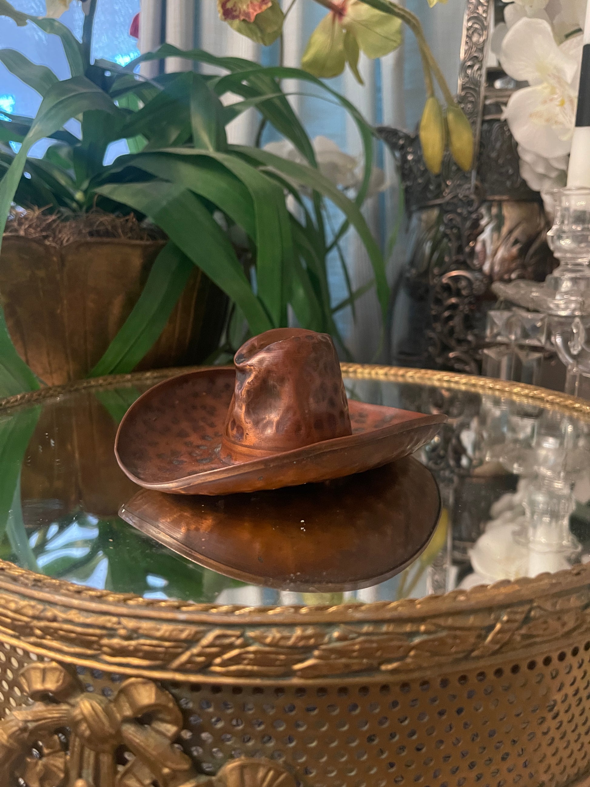 A vintage hand-hammered copper cowboy hat with the most incredible aged patina — warm bronze tones, dappled texture, and all the charm of a Hill Country sunset in metal form.