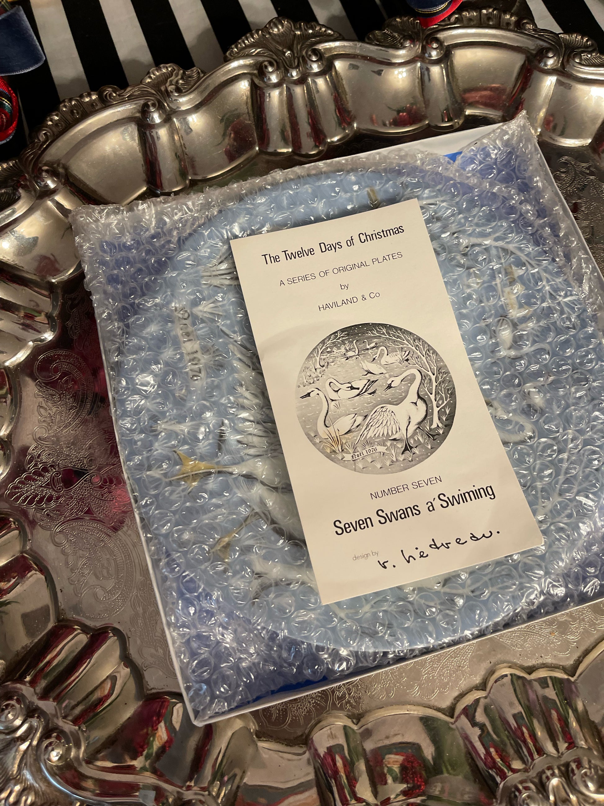 🎶On The Seventh Day of Christmas 🎶 This vintage Seven Swans A'Swimming is the seventh plate in the Twelve Days of Christmas Series by Haviland of Limoges. This French Blue is the perfect background for this beautifully vibrant depiction that will add so much charm to your holiday décor.