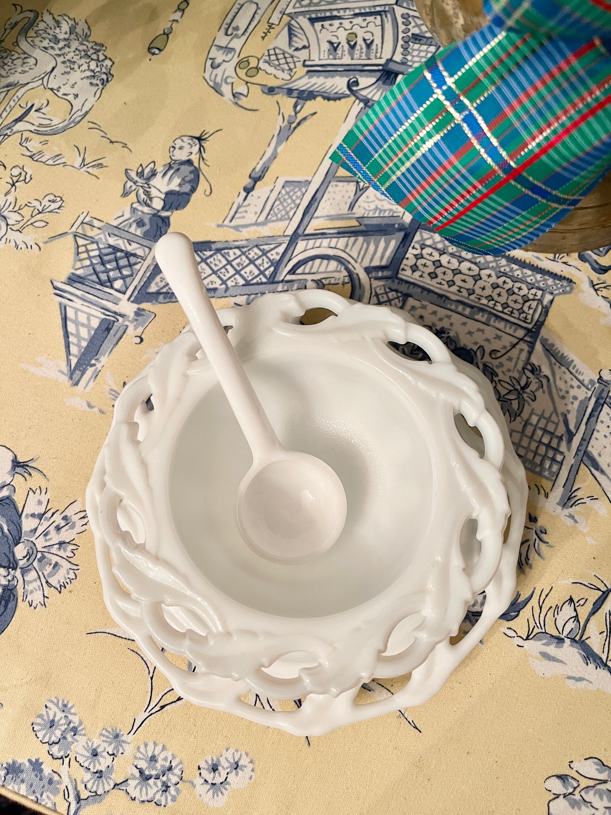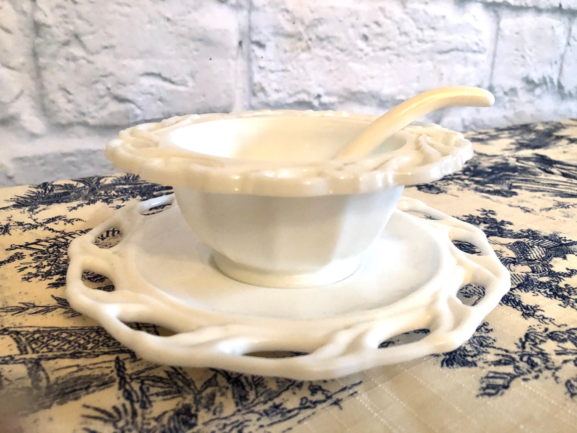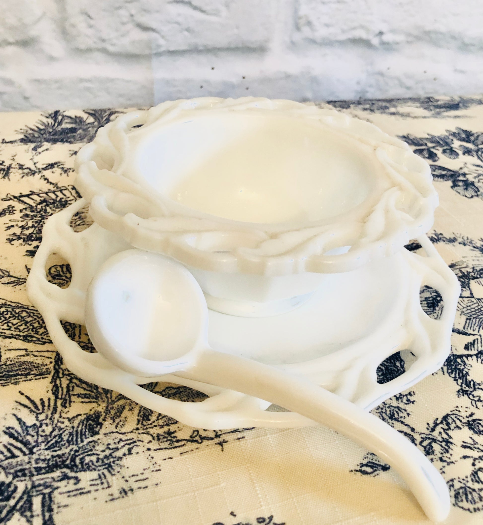 Vintage Imperial Glass Mayonnaise Bowl in the Star Holly milk glass pattern with ladle and underplate. It has the paneled sides and ruffled trim with embossed Holly leaves. This lovely set was produced between 1951-1955.
