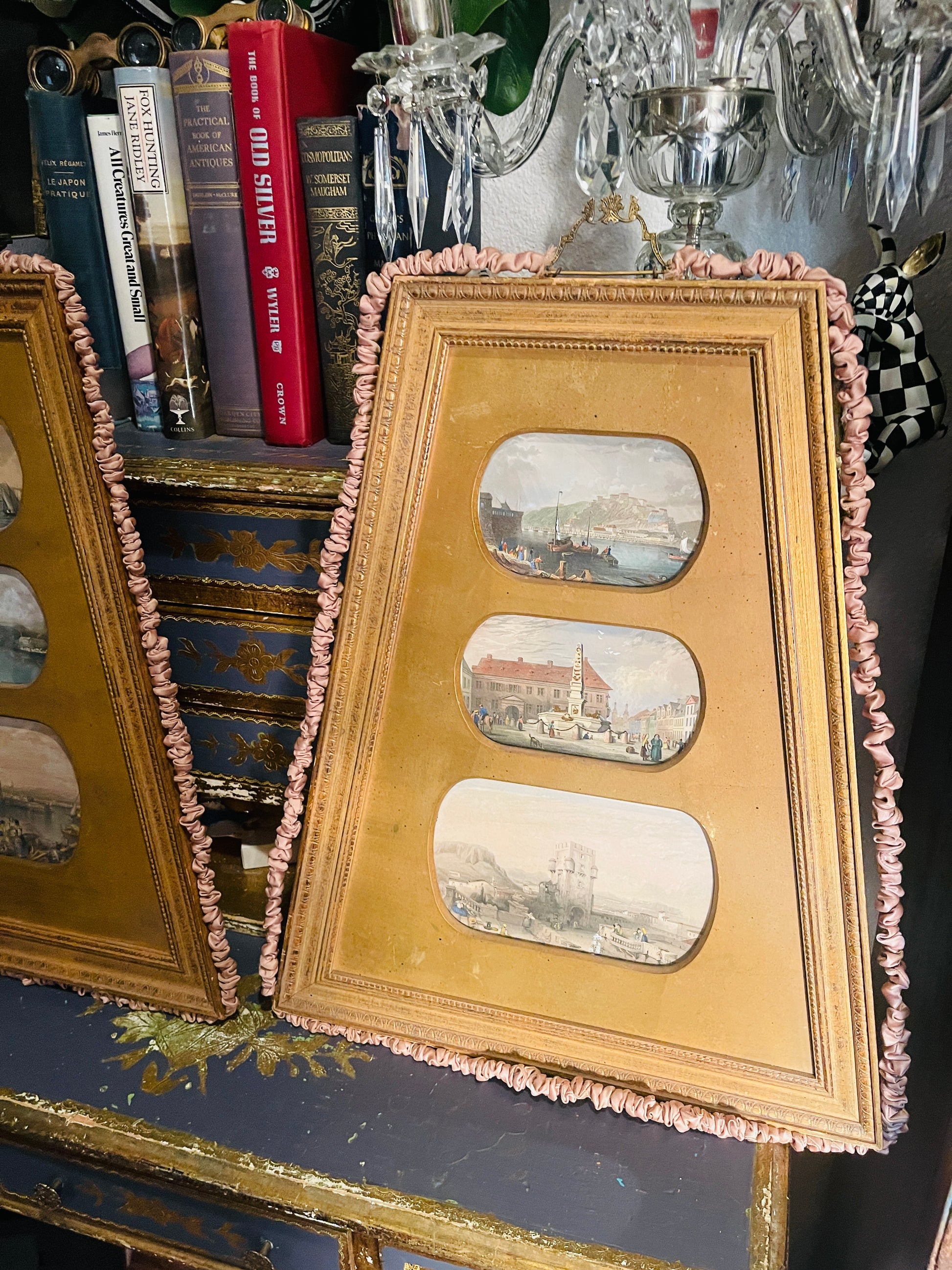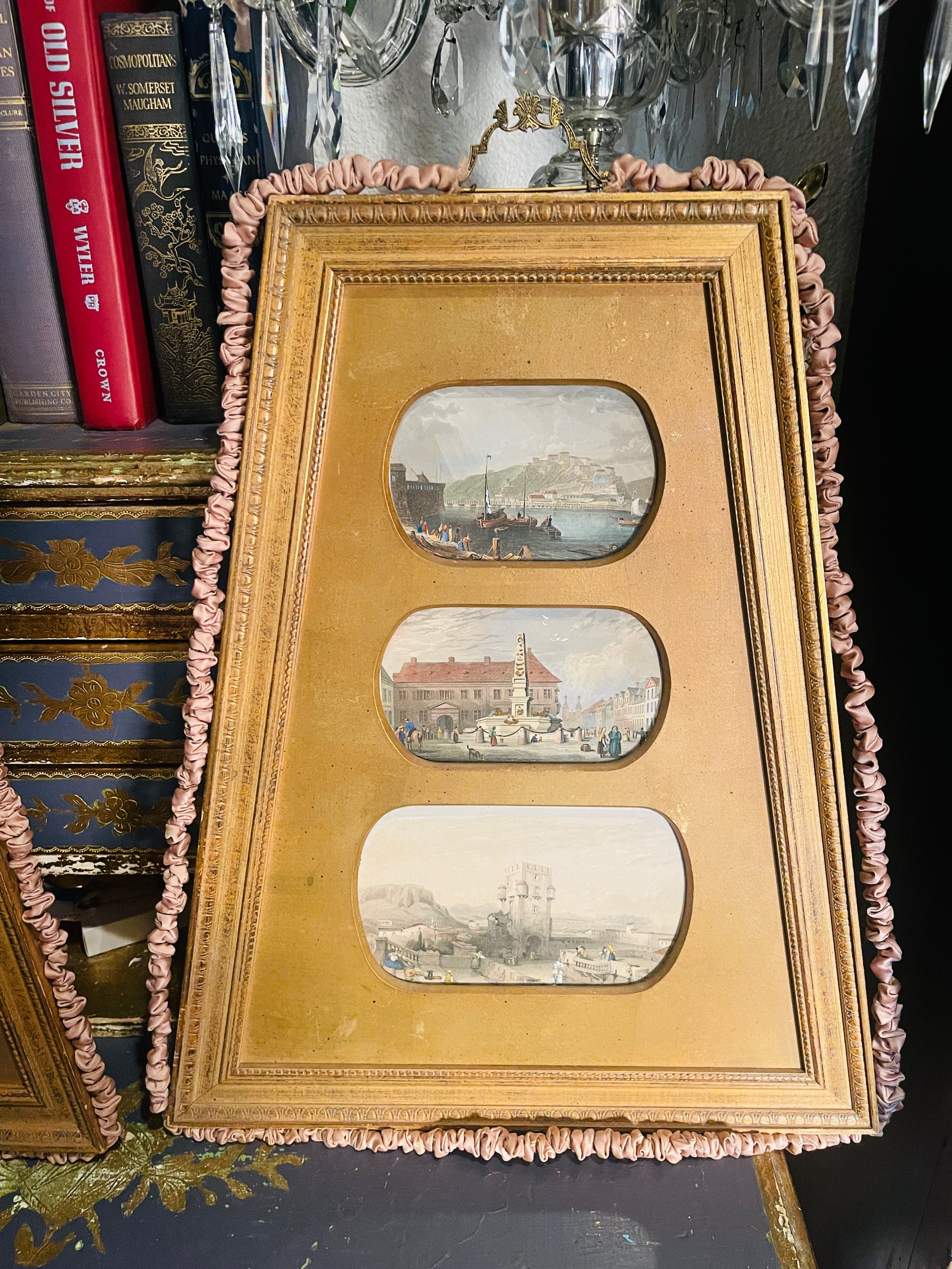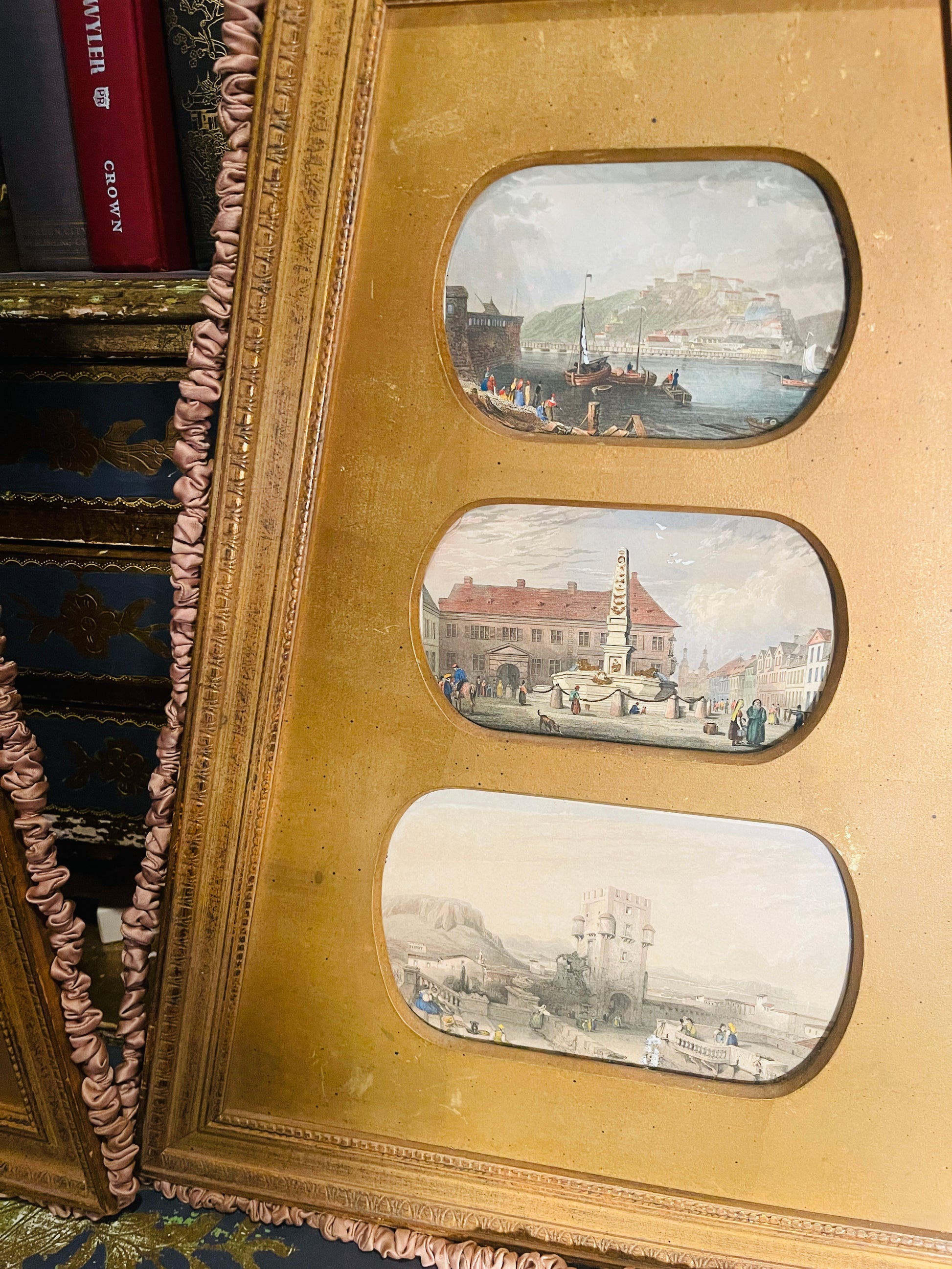 Set in ornate giltwood frames surrounded in fabric, these works evoke the timeless elegance of Italy’s Amalfi and Ligurian coasts—where fishing boats bob gently in turquoise waters and terracotta rooftops spill down to the sea. The combination of the luminous seaside imagery with the rich, gold-leaf finish creates a striking contrast that’s both refined and inviting.