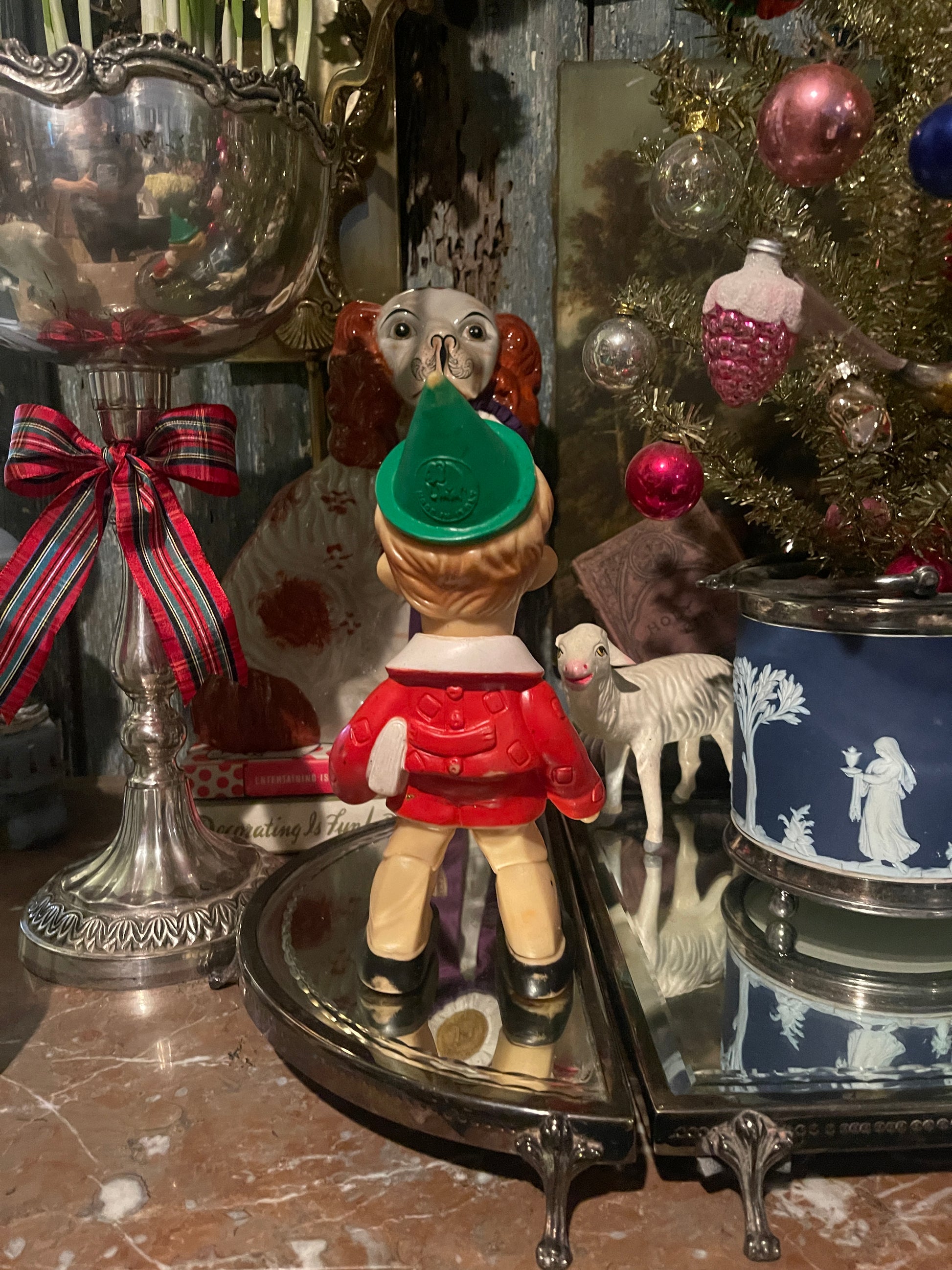 Bring a touch of fairytale magic to your holiday décor with this enchanting mid-century Italian Pinocchio figurine, crafted in soft molded rubber and finished with charming hand-painted details. Made in Italy during the 1960s and marked with the beloved R.M. elephant maker’s mark beneath his green cap, this nostalgic treasure embodies the whimsy and warmth of old-world Christmases.