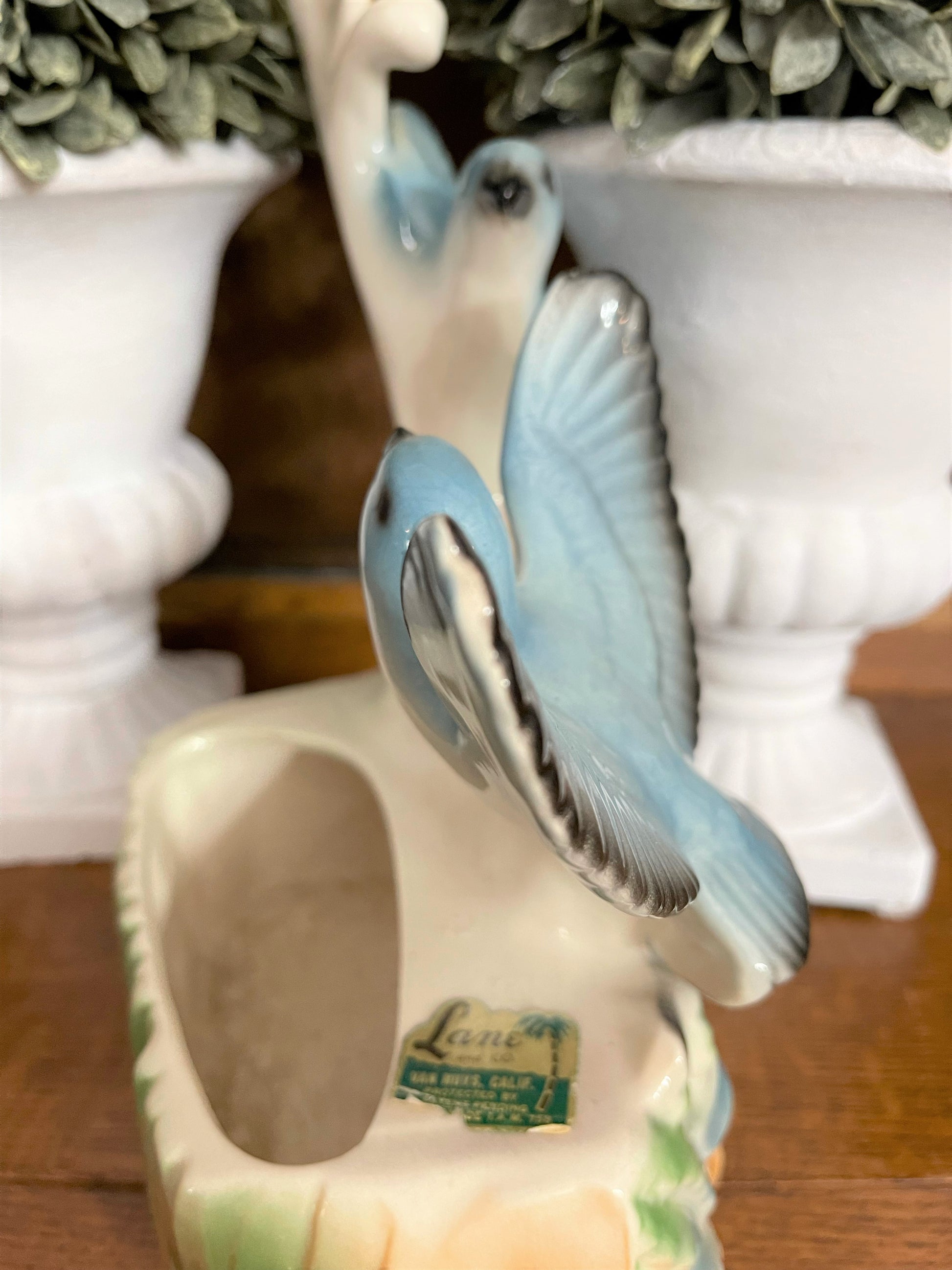 Vintage planter by Lane featuring two blue birds over some vibrant foliage. Such a pretty piece!