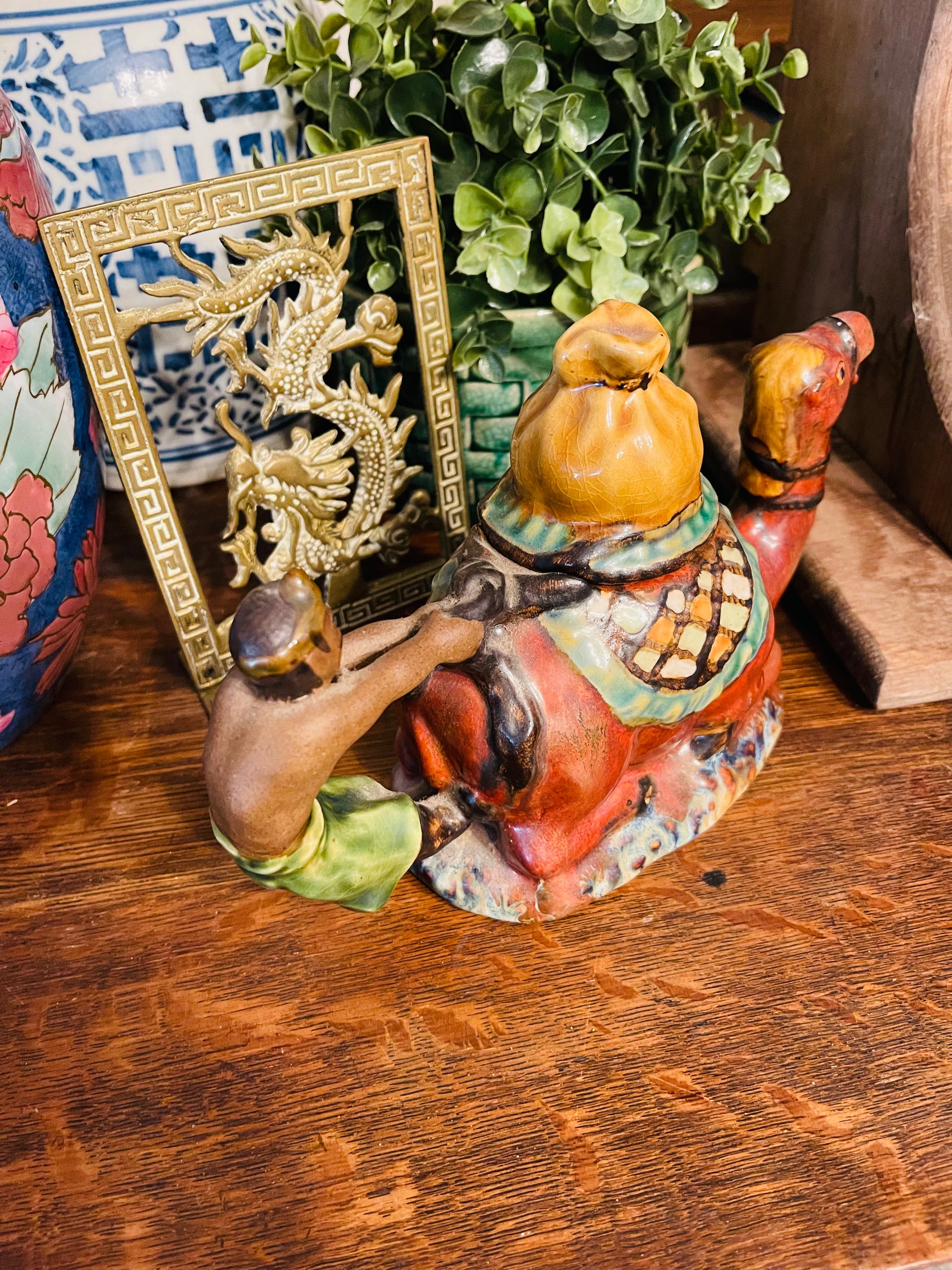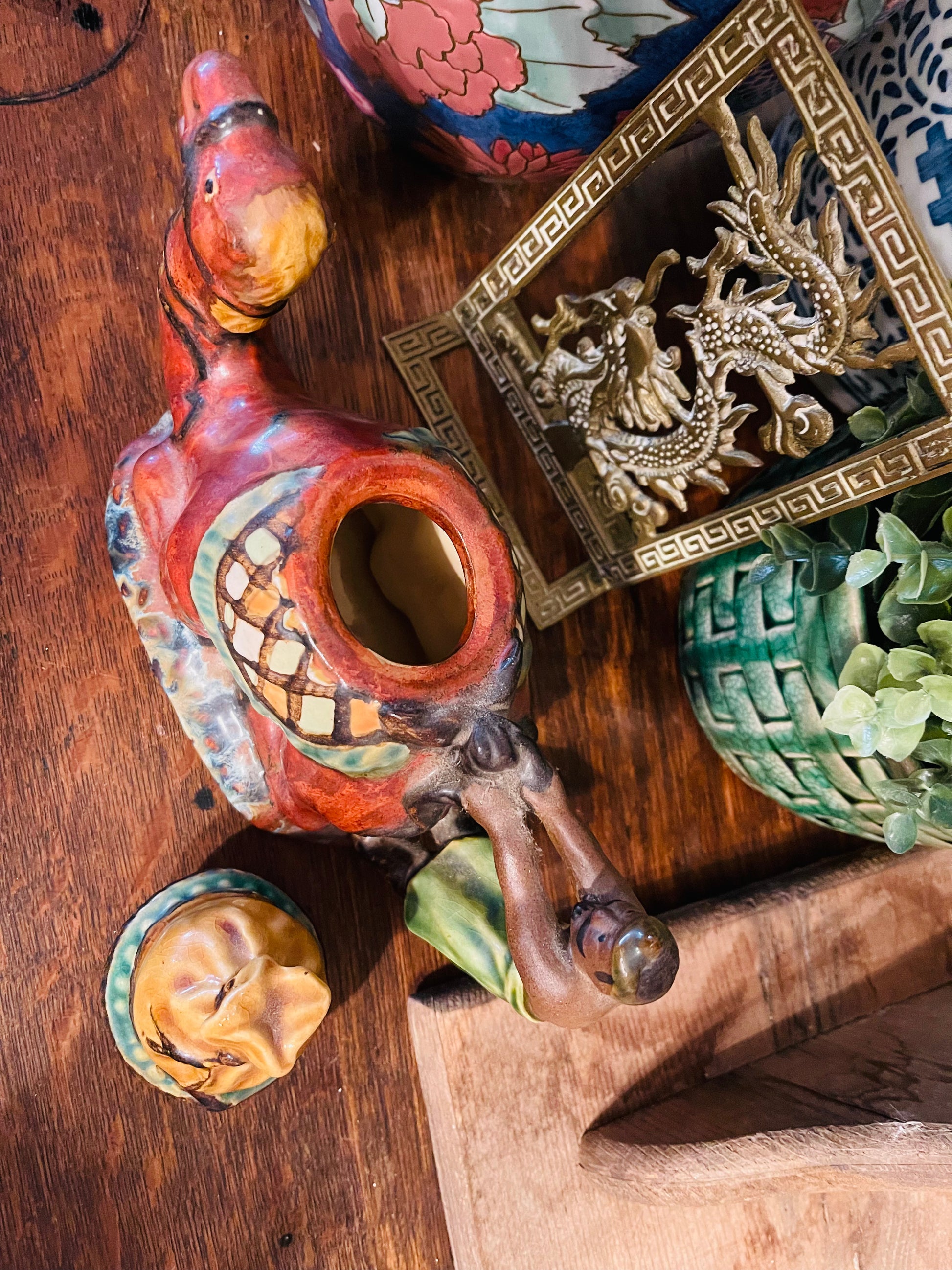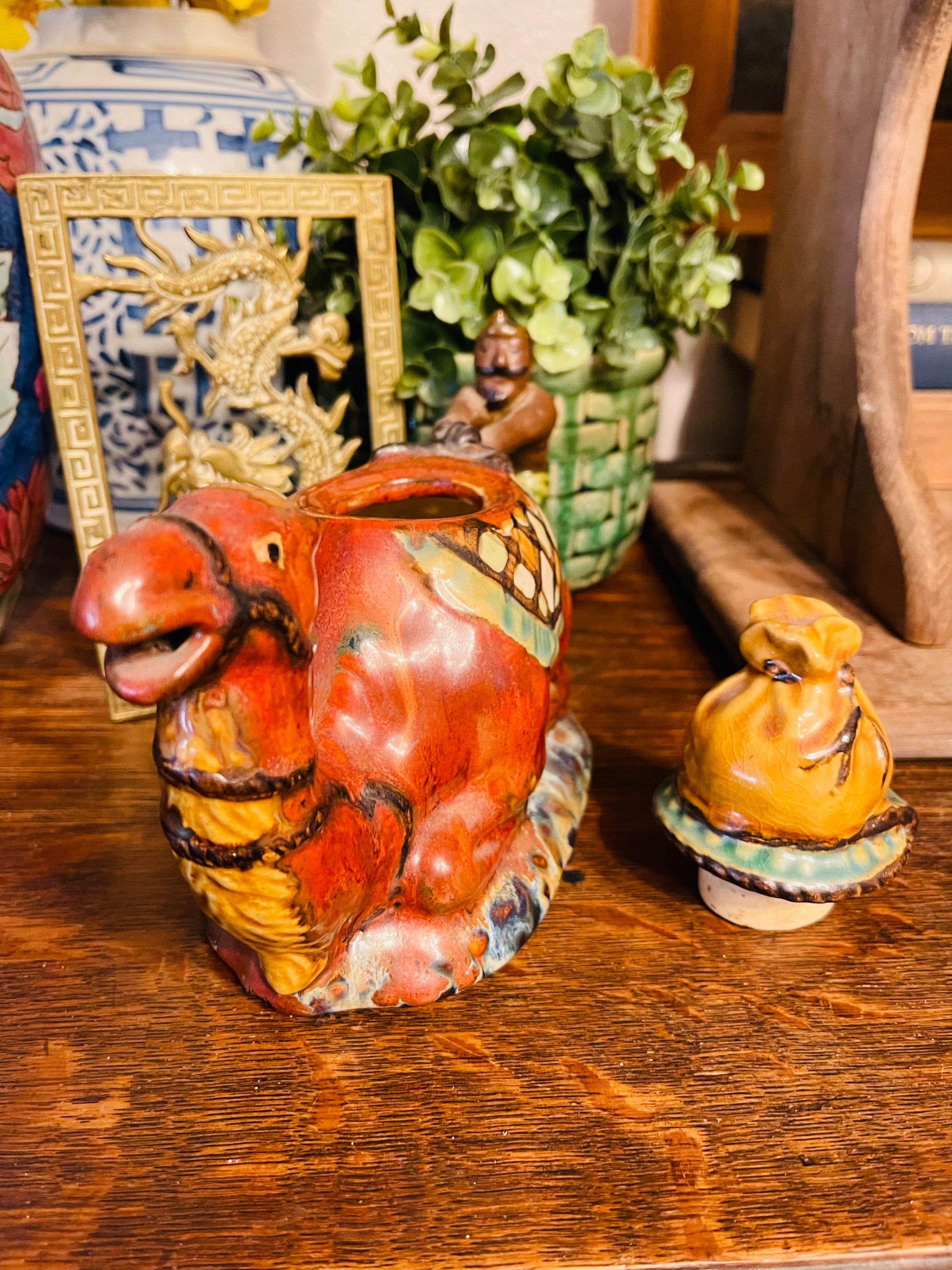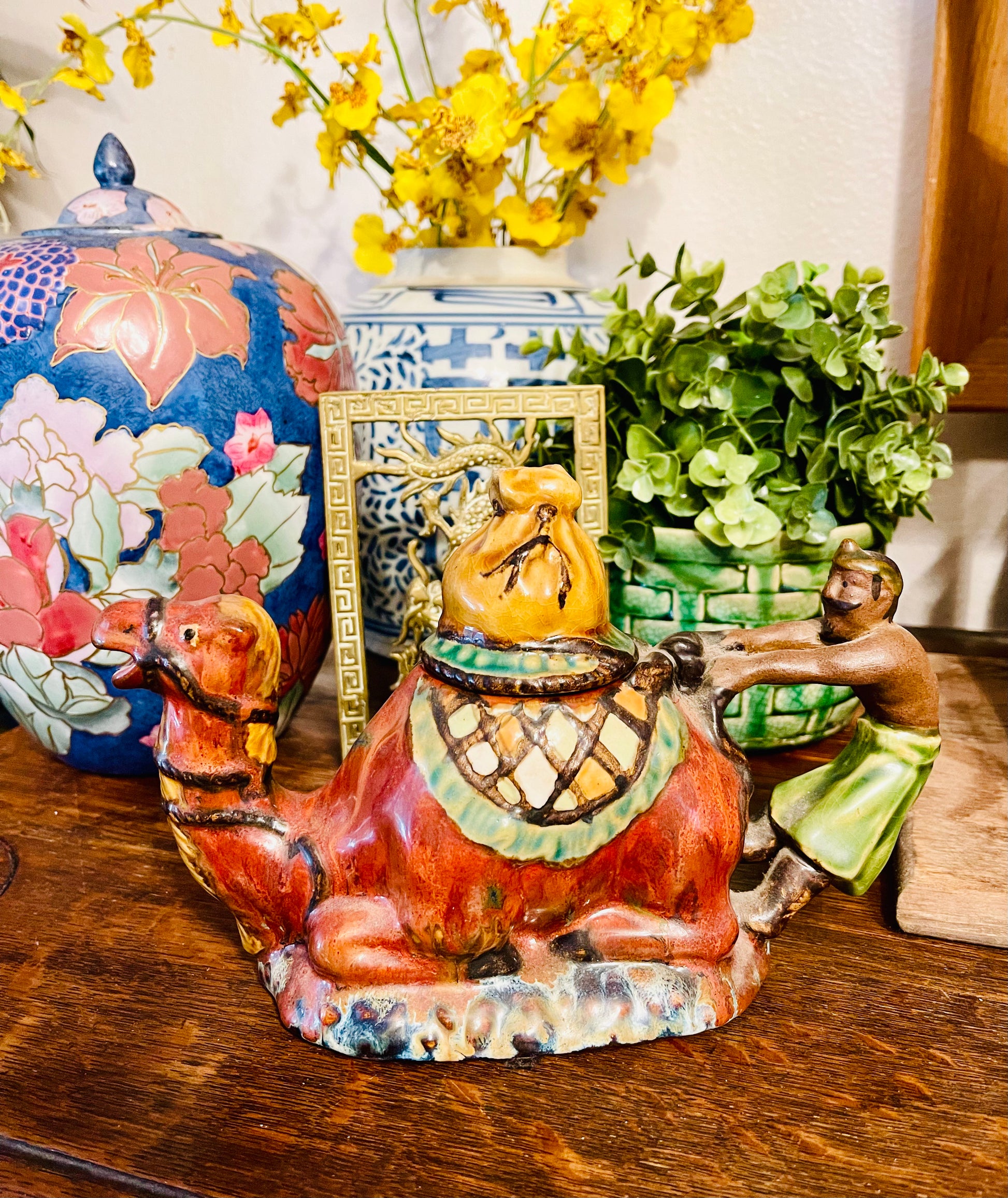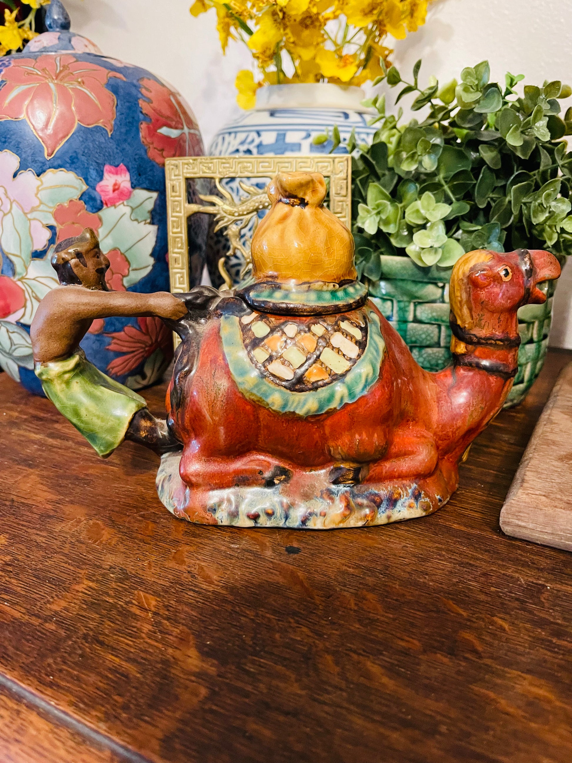 Vintage Majolica Camel Tea Pot circa late 20th century. The rider appears to be holding on for dear life, LOL. The hues of Green, Gold, and Cimmaron are rich and vibrant. This is such a great piece🐫that has been styled after an antique Minton piece. There is so much detail...I think my favorite part is how they made the bag on top of the lid. To me, you can't even tell...so well done.