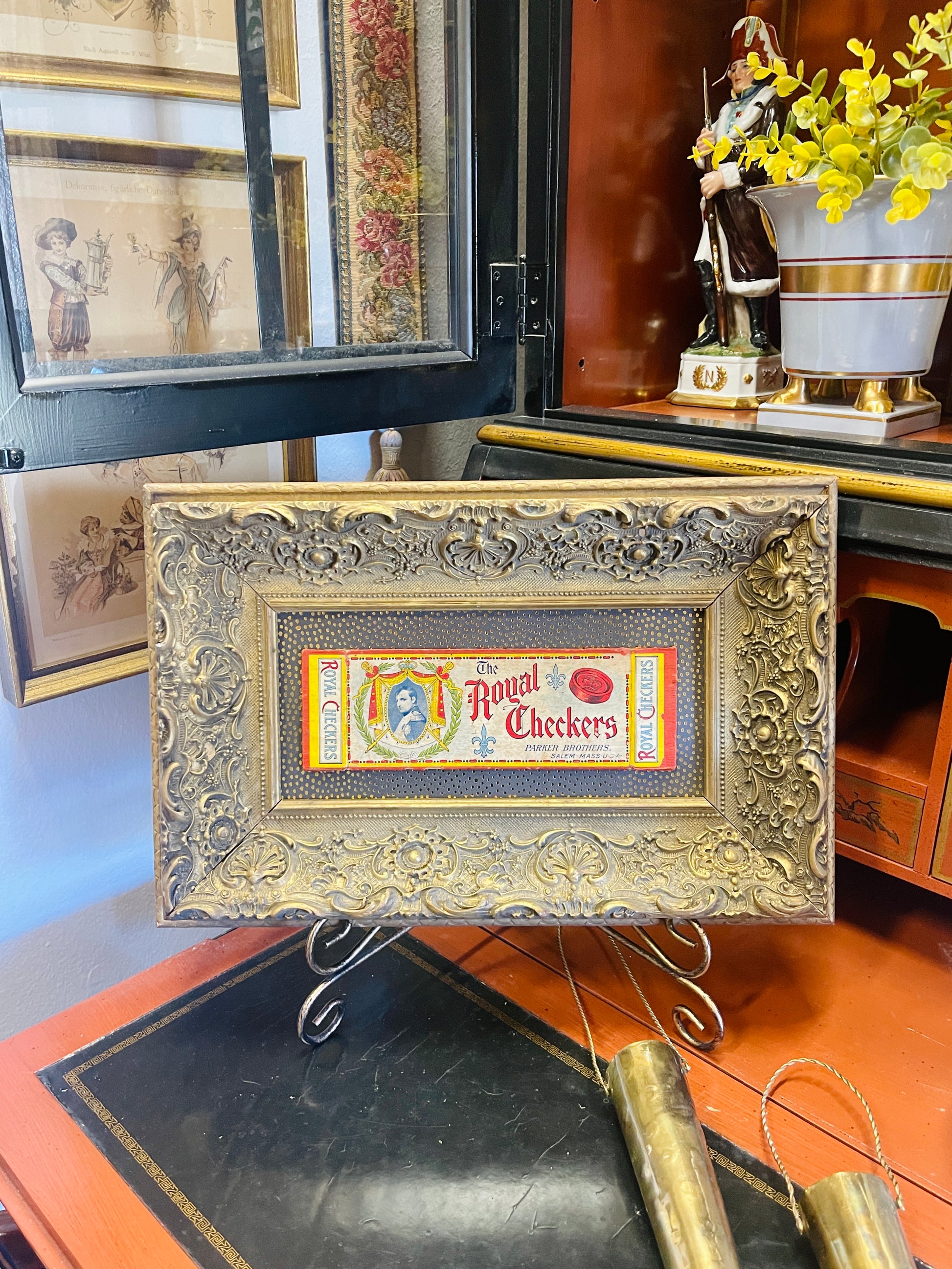 Vintage Royal Checkers Box Lid with Napoleon Bonaparte in an ornate solid wood gold frame. It’s the perfect piece for a game room.