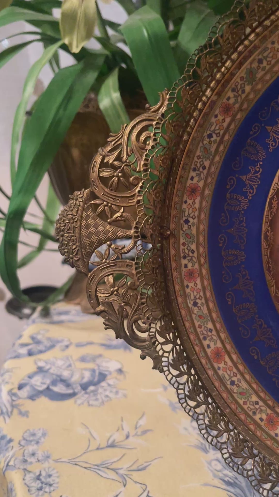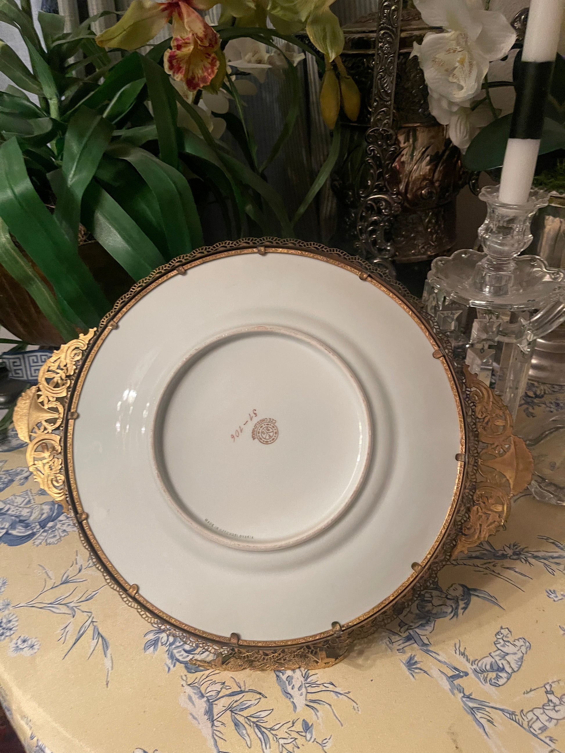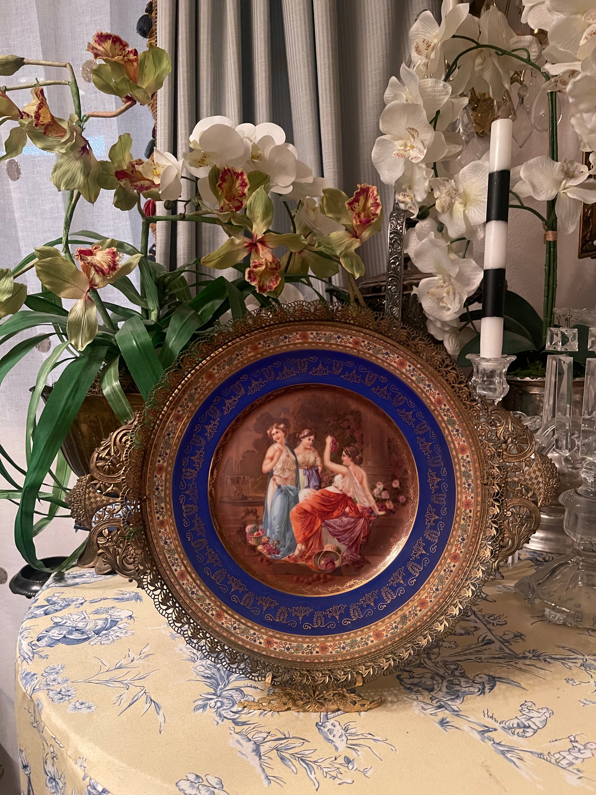 Encircled by a rich cobalt border with intricate gilt detailing, the plate radiates jewel-like brilliance. Yet what truly sets this offering apart is its exceptional gilt plate holder - a masterwork of metalwork — with elaborate filigree scrolls, delicate openwork, and sculptural flourishes that transform the porcelain into a centerpiece worthy of a grand salon.