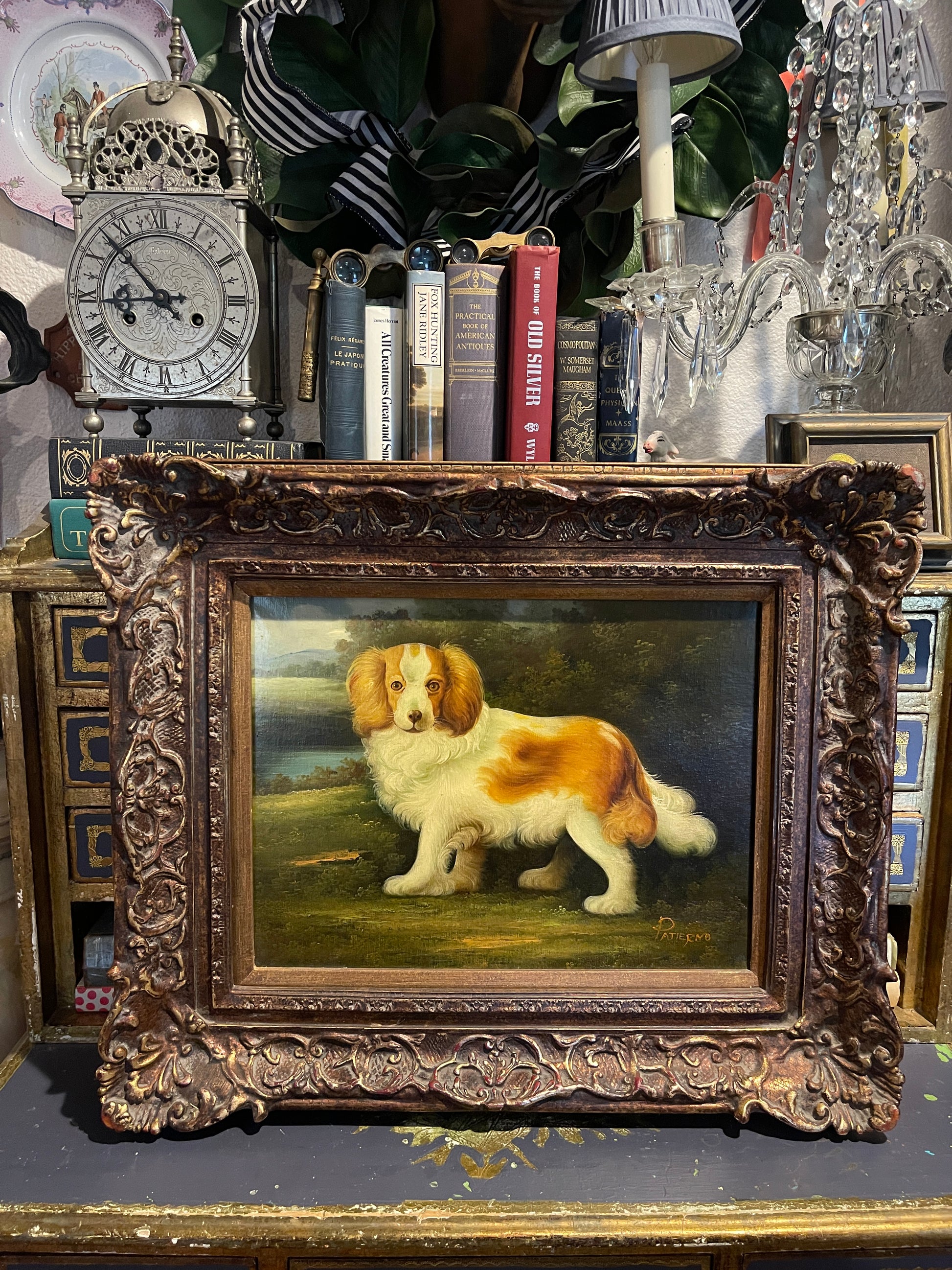 A portrait of loyalty and charm, this vintage oil painting captures the classic beauty of a Spaniel posed against a pastoral landscape. Rendered in warm earth tones with lifelike detail, the dog gazes outward with an expressive face, framed by rolling hills and a serene body of water in the distance. Signed Patierno in the lower right corner.