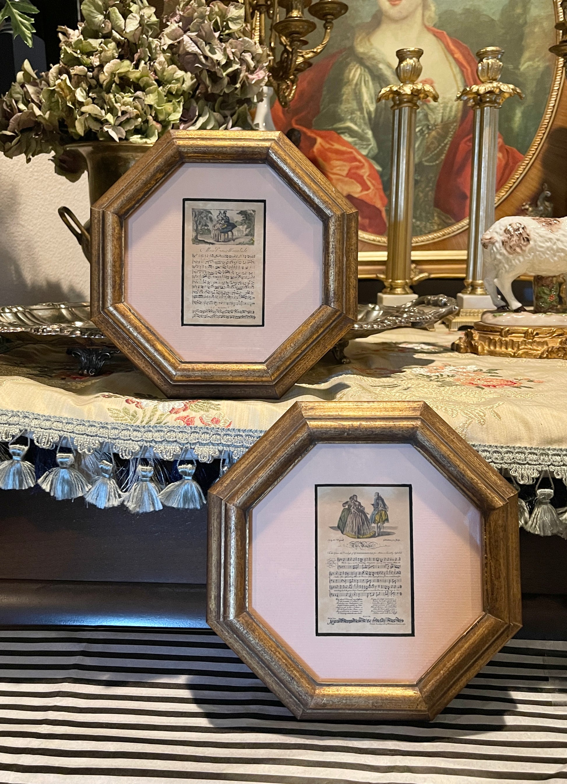 Vintage pair of framed George Bickham sheet music. Lovely French artwork matted in pink with gilded wood frames.