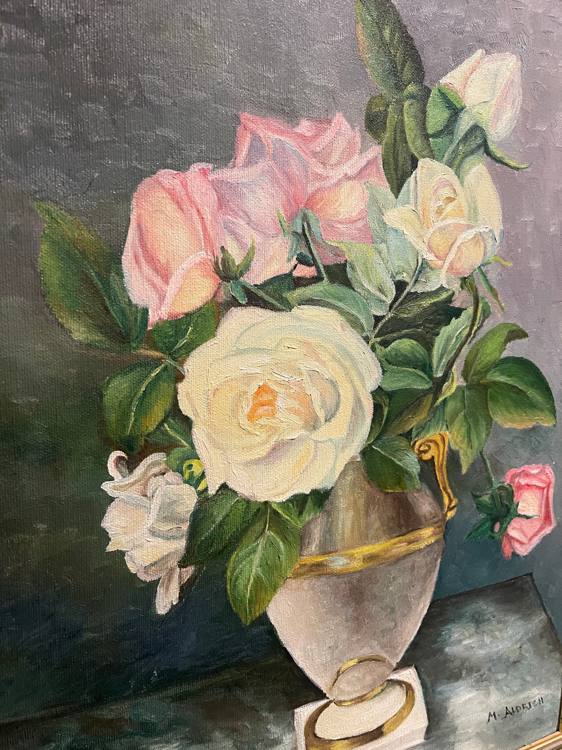 This exquisite vintage still life captures the timeless elegance of blooming garden roses nestled in a neoclassical urn. Soft pinks, creamy whites, and verdant greens unfurl in painterly strokes, evoking a sense of romance and refinement. The composition is rendered in rich oils and signed by the artist M. Anderson in the lower right corner.