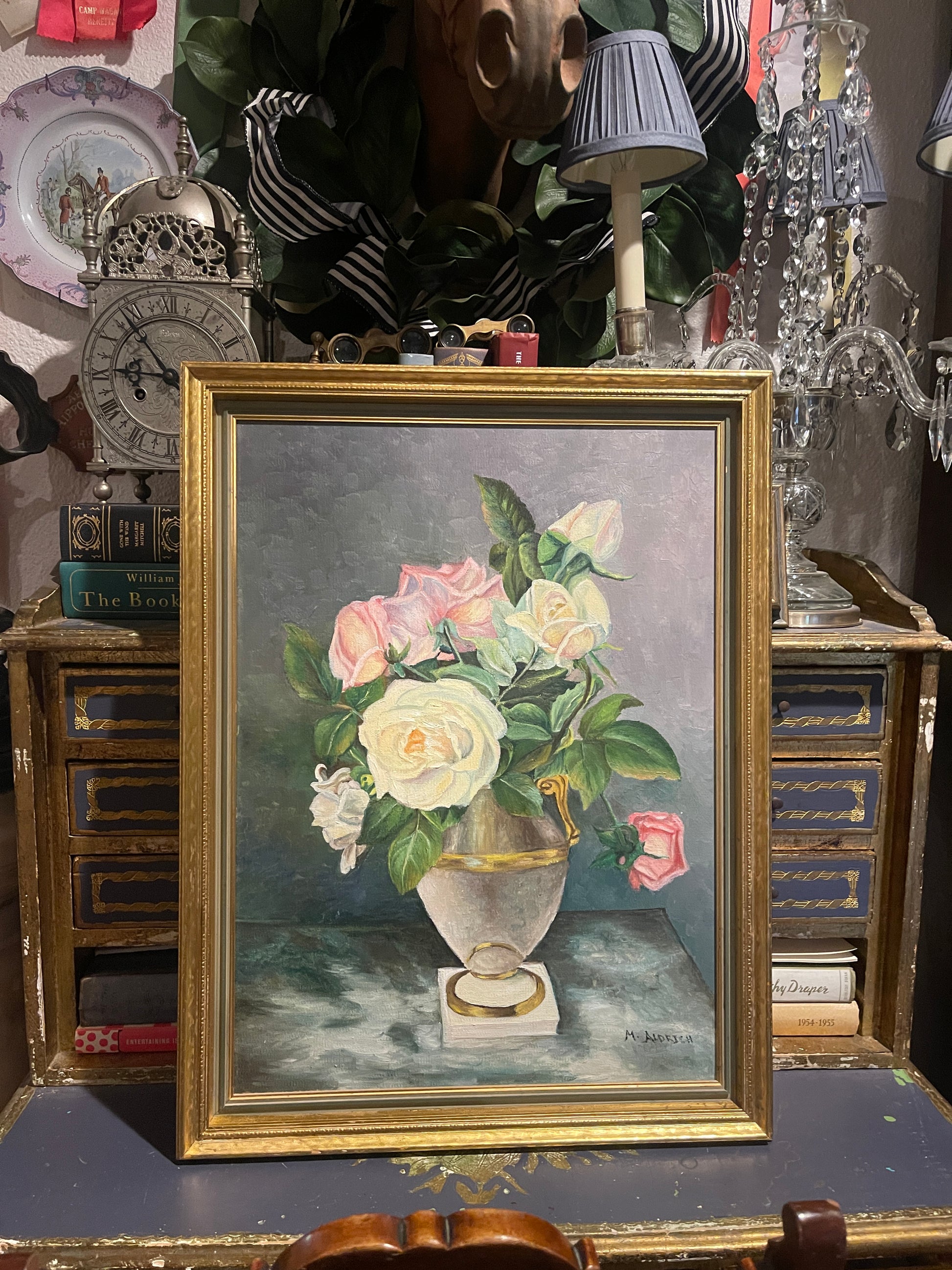 Set in a traditional gold wood frame with just the right hint of patina, this piece exudes heirloom beauty—ideal for lovers of cottagecore, French country, grandmillennial, or Southern maximalist décor. It’s a true statement piece whether hung above a settee or propped in a gallery wall vignette.
