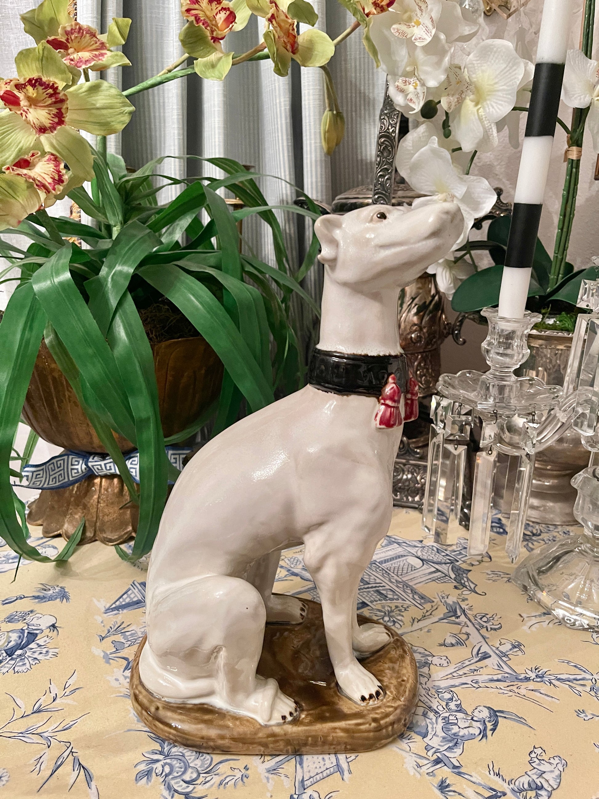 Vintage Whippet Statue with Tasseled Collar, Majolica Style, Hand Painted